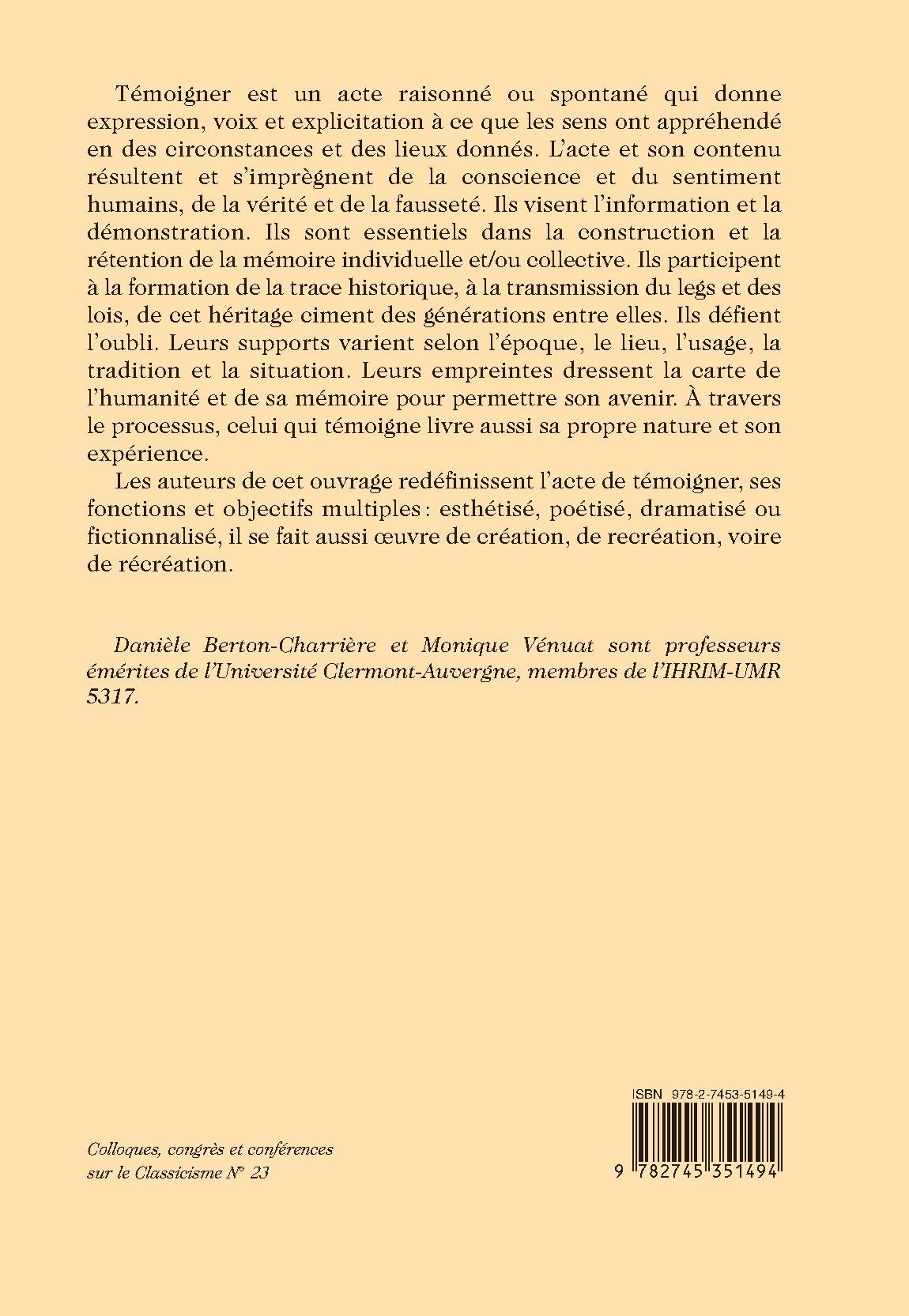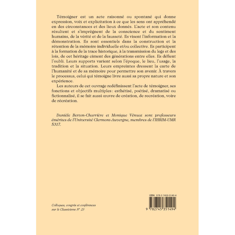 Les auteurs de cet ouvrage redéfinissent l’acte de témoigner, ses fonctions et objectifs multiples : esthétisé, poétisé, dramatisé ou fictionnalisé, il se fait aussi oeuvre de création, de recréation, voire de récréation.