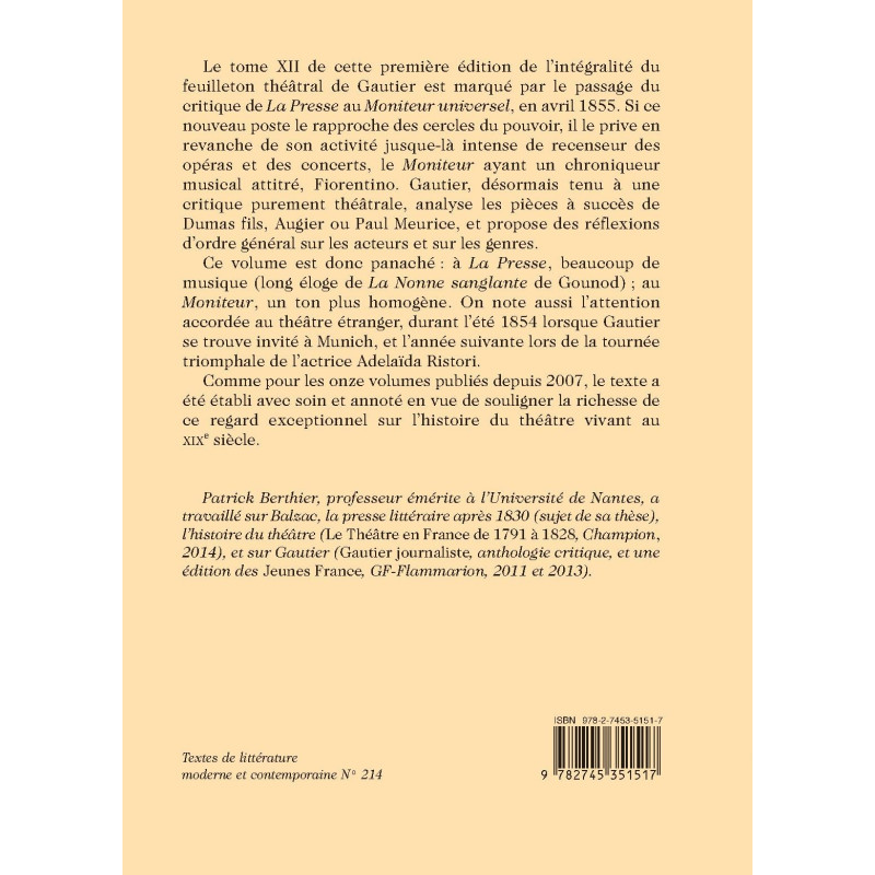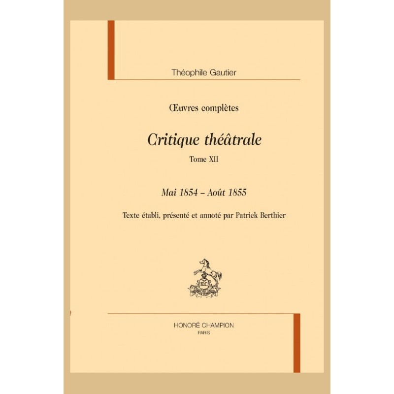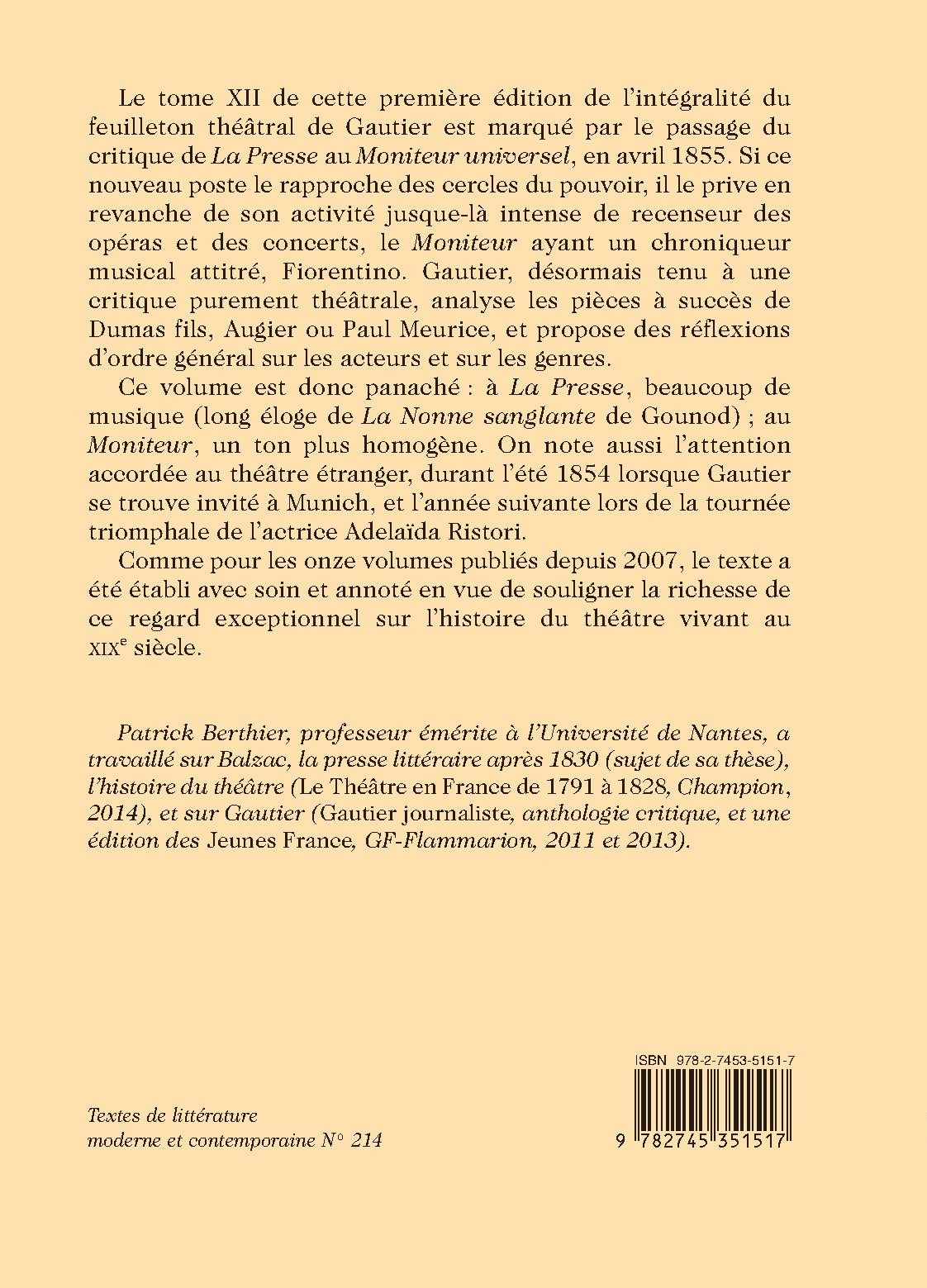 Le tome XII de cette première édition de l’intégralité du feuilleton théâtral de Gautier est marqué par le passage du critique de La Presse au Moniteur universel, en avril 1855. Si ce nouveau poste le rapproche des cercles du pouvoir, il le prive en revanche de son activité jusque-là intense de recenseur des opéras et des concerts, le Moniteur ayant un chroniqueur musical attitré, Fiorentino. Gautier, désormais tenu à une critique purement théâtrale, analyse les pièces à succès de Dumas fils, Augier ou Paul Meurice, et propose des réflexions d’ordre général sur les acteurs et sur les genres.