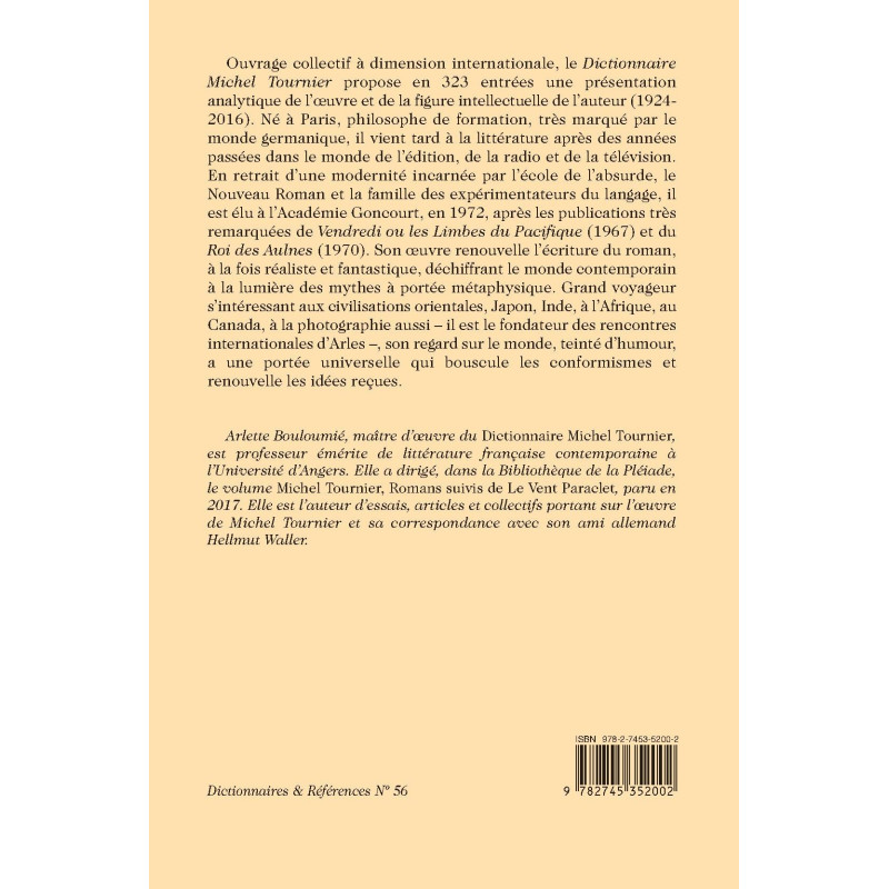 Ouvrage collectif à dimension internationale, le Dictionnaire Michel Tournier propose en 323 entrées une présentation analytique de l’oeuvre et de la figure intellectuelle de l’auteur (1924- 2016). Né à Paris, philosophe de formation, très marqué par le monde germanique, il vient tard à la littérature après des années passées dans le monde de l’édition, de la radio et de la télévision. En retrait d’une modernité incarnée par l’école de l’absurde, le Nouveau Roman et la famille des expérimentateurs du langage, il est élu à l’Académie Goncourt, en 1972, après les publications très remarquées de Vendredi ou les Limbes du Pacifique (1967) et du Roi des Aulnes (1970). Son oeuvre renouvelle l’écriture du roman, à la fois réaliste et fantastique, déchiffrant le monde contemporain à la lumière des mythes à portée métaphysique. Grand voyageur s’intéressant aux civilisations orientales, Japon, Inde, à l’Afrique, au Canada, à la photographie aussi – il est le fondateur des rencontres internationales d’Arles –, son regard sur le monde, teinté d’humour, a une portée universelle qui bouscule les conformismes et renouvelle les idées reçues.
