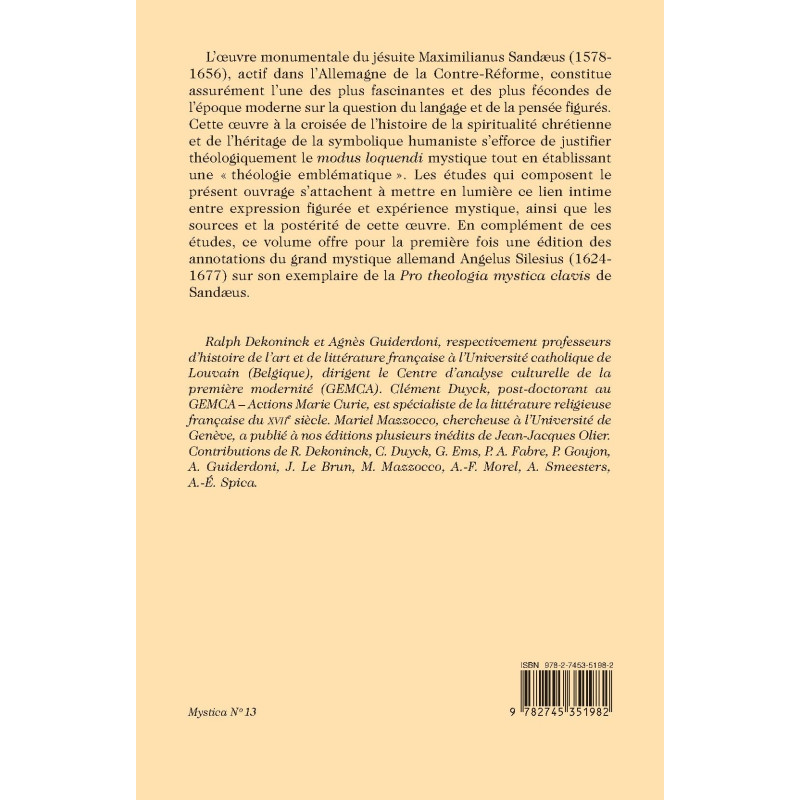 L’œuvre monumentale du jésuite Maximilianus Sandæus (1578- 1656), actif dans l’Allemagne de la Contre-Réforme, constitue assurément l’une des plus fascinantes et des plus fécondes de l’époque moderne sur la question du langage et de la pensée figurés. Cette oeuvre à la croisée de l’histoire de la spiritualité chrétienne et de l’héritage de la symbolique humaniste s’efforce de justifier théologiquement le modus loquendi mystique tout en établissant une « théologie emblématique ». Les études qui composent le présent ouvrage s’attachent à mettre en lumière ce lien intime entre expression figurée et expérience mystique, ainsi que les sources et la postérité de cette oeuvre. En complément de ces études, ce volume offre pour la première fois une édition des annotations du grand mystique allemand Angelus Silesius (1624-1677) sur son exemplaire de la Pro theologia mystica clavis de Sandæus.