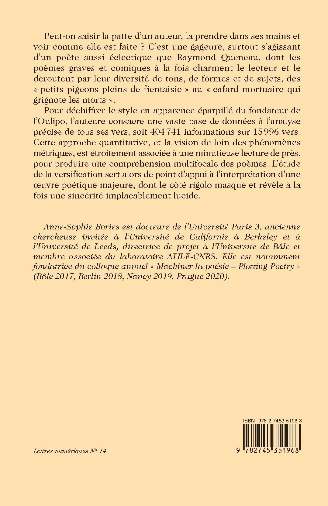 Pour déchiffrer le style en apparence éparpillé du fondateur de l’Oulipo, l’auteure consacre une vaste base de données à l’analyse précise de tous ses vers, soit 404 741 informations sur 15 996 vers. Cette approche quantitative, et la vision de loin des phénomènes métriques, est étroitement associée à une minutieuse lecture de près, pour produire une compréhension multifocale des poèmes. L’étude de la versification sert alors de point d’appui à l’interprétation d’une oeuvre poétique majeure, dont le côté rigolo masque et révèle à la fois une sincérité implacablement lucide.