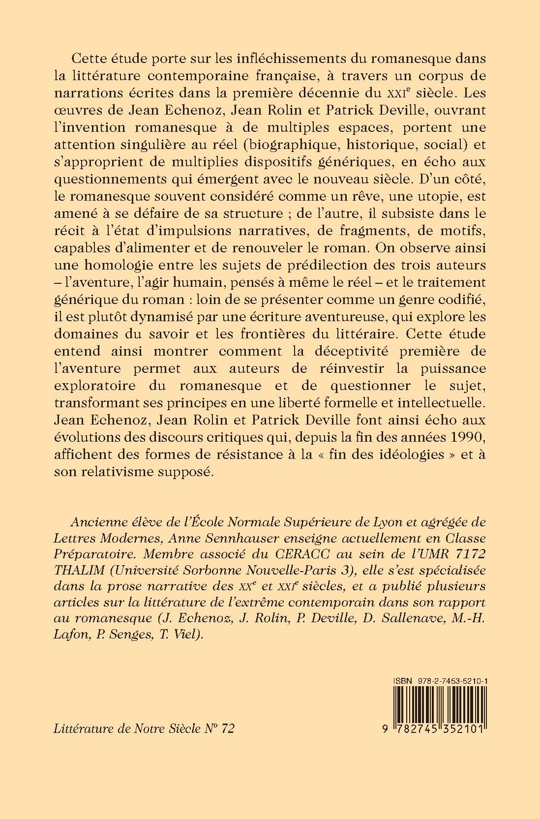 Cette étude porte sur les infléchissements du romanesque dans la littérature contemporaine française, à travers un corpus de narrations écrites dans la première décennie du XXIe siècle. Les œuvres de Jean Echenoz, Jean Rolin et Patrick Deville, ouvrant l’invention romanesque à de multiples espaces, portent une attention singulière au réel (biographique, historique, social) et s’approprient de multiplies dispositifs génériques, en écho aux questionnements qui émergent avec le nouveau siècle. D’un côté, le romanesque souvent considéré comme un rêve, une utopie, est amené à se défaire de sa structure ; de l’autre, il subsiste dans le récit à l’état d’impulsions narratives, de fragments, de motifs, capables d’alimenter et de renouveler le roman. On observe ainsi une homologie entre les sujets de prédilection des trois auteurs – l’aventure, l’agir humain, pensés à même le réel – et le traitement générique du roman : loin de se présenter comme un genre codifié, il est plutôt dynamisé par une écriture aventureuse, qui explore les domaines du savoir et les frontières du littéraire. Cette étude entend ainsi montrer comment la déceptivité première de l’aventure permet aux auteurs de réinvestir la puissance exploratoire du romanesque et de questionner le sujet, transformant ses principes en une liberté formelle et intellectuelle. Jean Echenoz, Jean Rolin et Patrick Deville font ainsi écho aux évolutions des discours critiques qui, depuis la fin des années 1990, affichent des formes de résistance à la « fin des idéologies » et à son relativisme supposé.