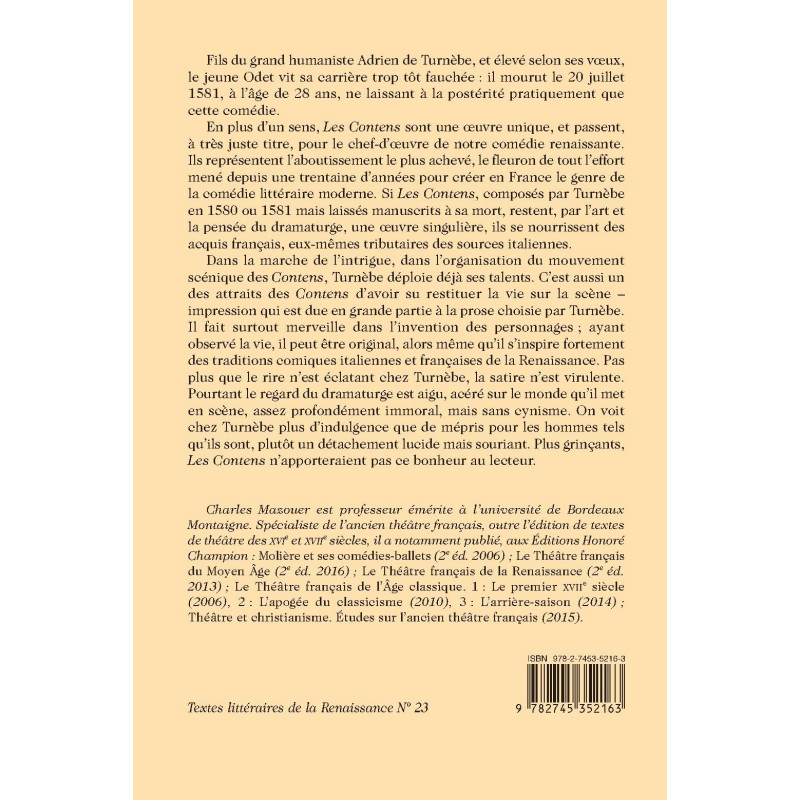 Dans la marche de l’intrigue, dans l’organisation du mouvement scénique des Contens, Turnèbe déploie déjà ses talents. C’est aussi un des attraits des Contens d’avoir su restituer la vie sur la scène – impression qui est due en grande partie à la prose choisie par Turnèbe. Il fait surtout merveille dans l’invention des personnages ; ayant observé la vie, il peut être original, alors même qu’il s’inspire fortement des traditions comiques italiennes et françaises de la Renaissance. Pas plus que le rire n’est éclatant chez Turnèbe, la satire n’est virulente. Pourtant le regard du dramaturge est aigu, acéré sur le monde qu’il met en scène, assez profondément immoral, mais sans cynisme. On voit chez Turnèbe plus d’indulgence que de mépris pour les hommes tels qu’ils sont, plutôt un détachement lucide mais souriant. Plus grinçants, Les Contens n’apporteraient pas ce bonheur au lecteur.
