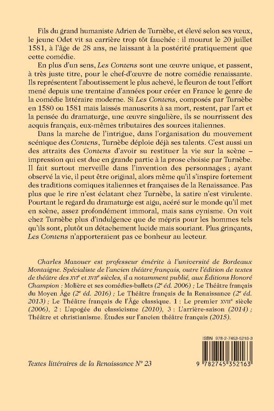 En plus d’un sens, Les Contens sont une oeuvre unique, et passent, à très juste titre, pour le chef-d’œuvre de notre comédie renaissante. Ils représentent l’aboutissement le plus achevé, le fleuron de tout l’effort mené depuis une trentaine d’années pour créer en France le genre de la comédie littéraire moderne. Si Les Contens, composés par Turnèbe en 1580 ou 1581 mais laissés manuscrits à sa mort, restent, par l’art et la pensée du dramaturge, une oeuvre singulière, ils se nourrissent des acquis français, eux-mêmes tributaires des sources italiennes.