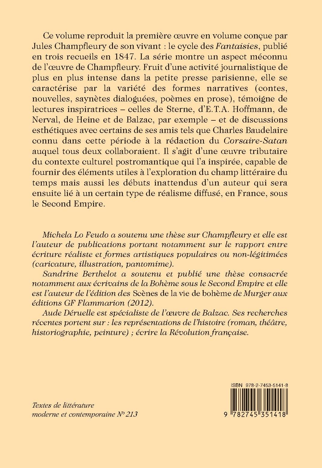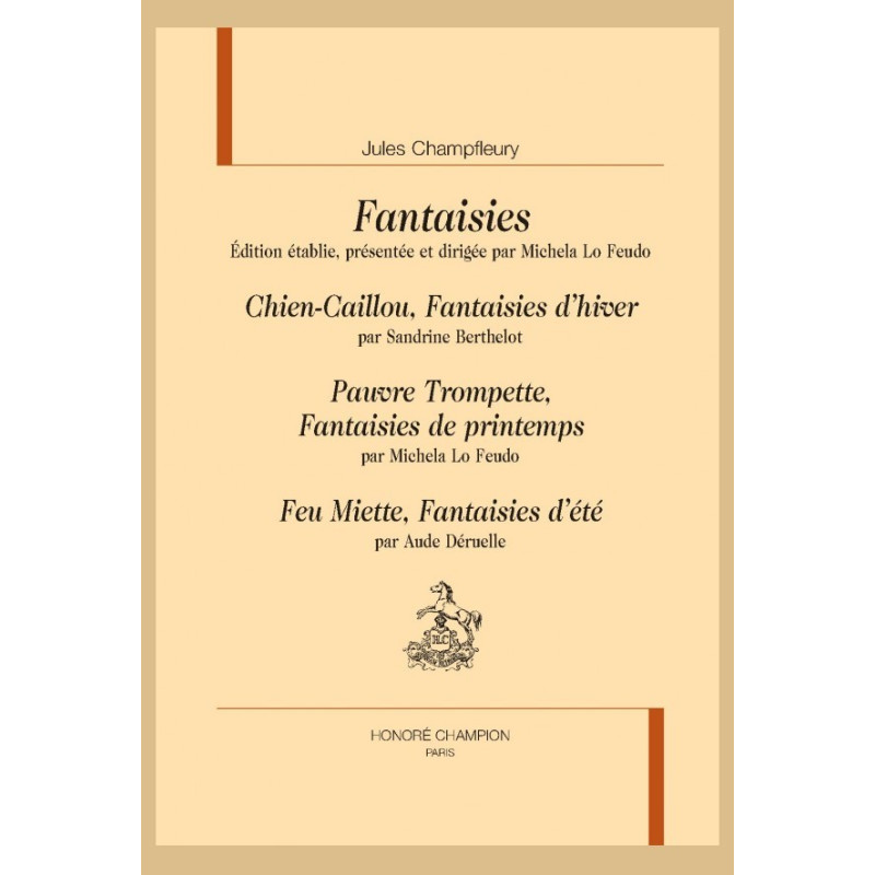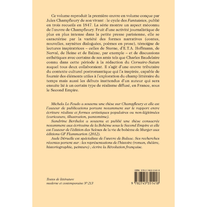 Ce volume reproduit la première œuvre en volume conçue par Jules Champfleury de son vivant : le cycle des Fantaisies, publié en trois recueils en 1847. La série montre un aspect méconnu de l’oeuvre de Champfleury. Fruit d’une activité journalistique de plus en plus intense dans la petite presse parisienne, elle se caractérise par la variété des formes narratives (contes, nouvelles, saynètes dialoguées, poèmes en prose), témoigne de lectures inspiratrices – celles de Sterne, d’E.T.A. Hoffmann, de Nerval, de Heine et de Balzac, par exemple – et de discussions esthétiques avec certains de ses amis tels que Charles Baudelaire connu dans cette période à la rédaction du Corsaire-Satan auquel tous deux collaboraient. Il s’agit d’une œuvre tributaire du contexte culturel postromantique qui l’a inspirée, capable de fournir des éléments utiles à l’exploration du champ littéraire du temps mais aussi les débuts inattendus d’un auteur qui sera ensuite lié à un certain type de réalisme diffusé, en France, sous le Second Empire.