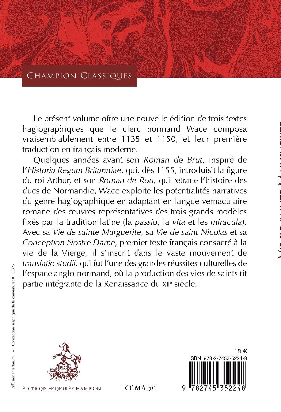 Quelques années avant son Roman de Brut, inspiré de l’Historia Regum Britanniae, qui, dès 1155, introduisit la figure du roi Arthur, et son Roman de Rou, qui retrace l’histoire des ducs de Normandie, Wace exploite les potentialités narratives du genre hagiographique en adaptant en langue vernaculaire romane des œuvres représentatives des trois grands modèles fixés par la tradition latine (la passio, la vita et les miracula). Avec sa Vie de sainte Marguerite, sa Vie de saint Nicolas et sa Conception Nostre Dame, premier texte français consacré à la vie de la Vierge, il s’inscrit dans le vaste mouvement de translatio studii, qui fut l’une des grandes réussites culturelles de l’espace anglo-normand, où la production des vies de saints fit partie intégrante de la Renaissance du XIIe siècle.