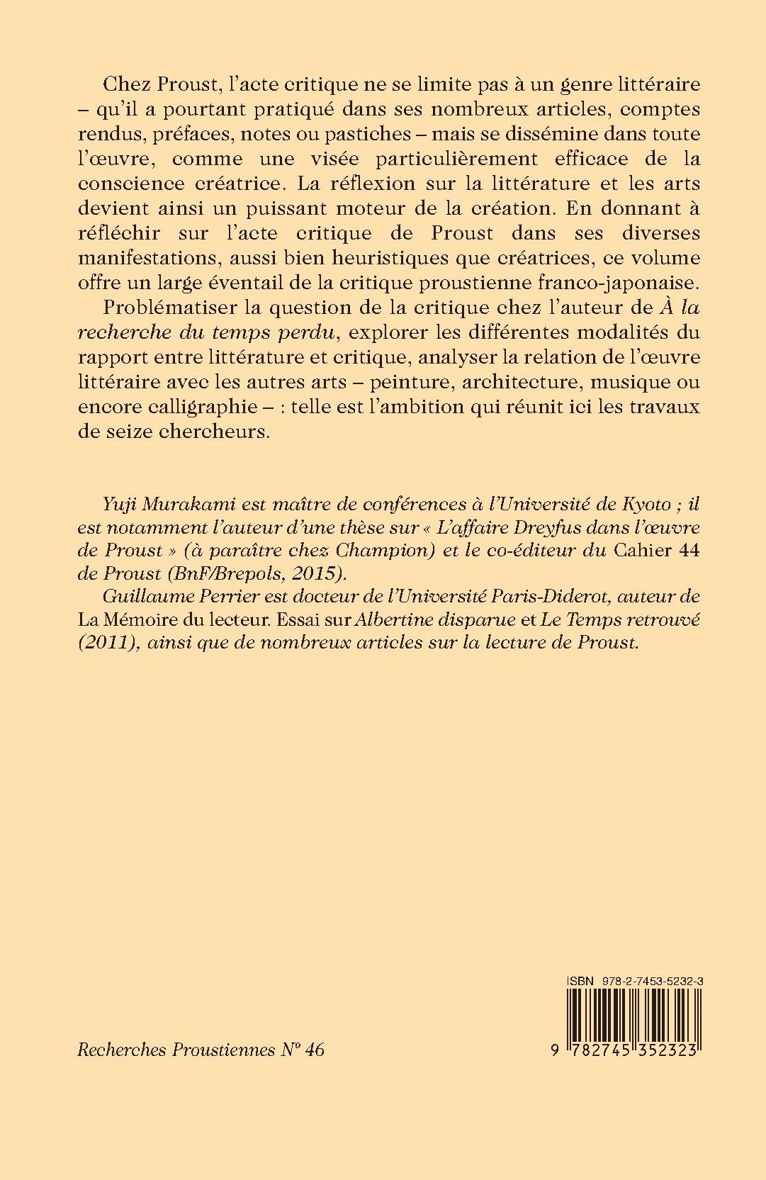 Chez Proust, l’acte critique ne se limite pas à un genre littéraire – qu’il a pourtant pratiqué dans ses nombreux articles, comptes rendus, préfaces, notes ou pastiches – mais se dissémine dans toute l’oeuvre, comme une visée particulièrement efficace de la conscience créatrice. La réflexion sur la littérature et les arts devient ainsi un puissant moteur de la création. En donnant à réfléchir sur l’acte critique de Proust dans ses diverses manifestations, aussi bien heuristiques que créatrices, ce volume offre un large éventail de la critique proustienne franco-japonaise.