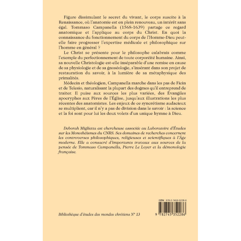 Figure dissimulant le secret du vivant, le corps suscite à la Renaissance, où l’anatomie est en plein renouveau, un intérêt sans égal. Tommaso Campanella (1568-1639) partage ce regard anatomique et l’applique au corps du Christ. En quoi la connaissance du fonctionnement du corps de l’Homme-Dieu peut-elle faire progresser l’expertise médicale et philosophique sur l’homme en général ?