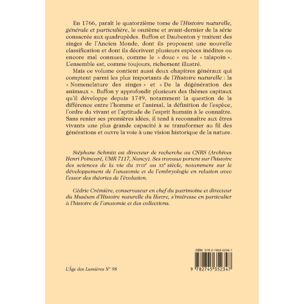 Mais ce volume contient aussi deux chapitres généraux qui comptent parmi les plus importants de l’Histoire naturelle : la « Nomenclature des singes » et « De la dégénération des animaux ». Buffon y approfondit plusieurs des thèmes capitaux qu’il développe depuis 1749, notamment la question de la différence entre l’homme et l’animal, la définition de l’espèce, l’ordre du vivant et l’aptitude de l’esprit humain à le connaître. Sans renier ses premières idées, il tend à reconnaître aux êtres vivants une plus grande capacité à se transformer au fil des générations et ouvre la voie à une vision historique de la nature.
