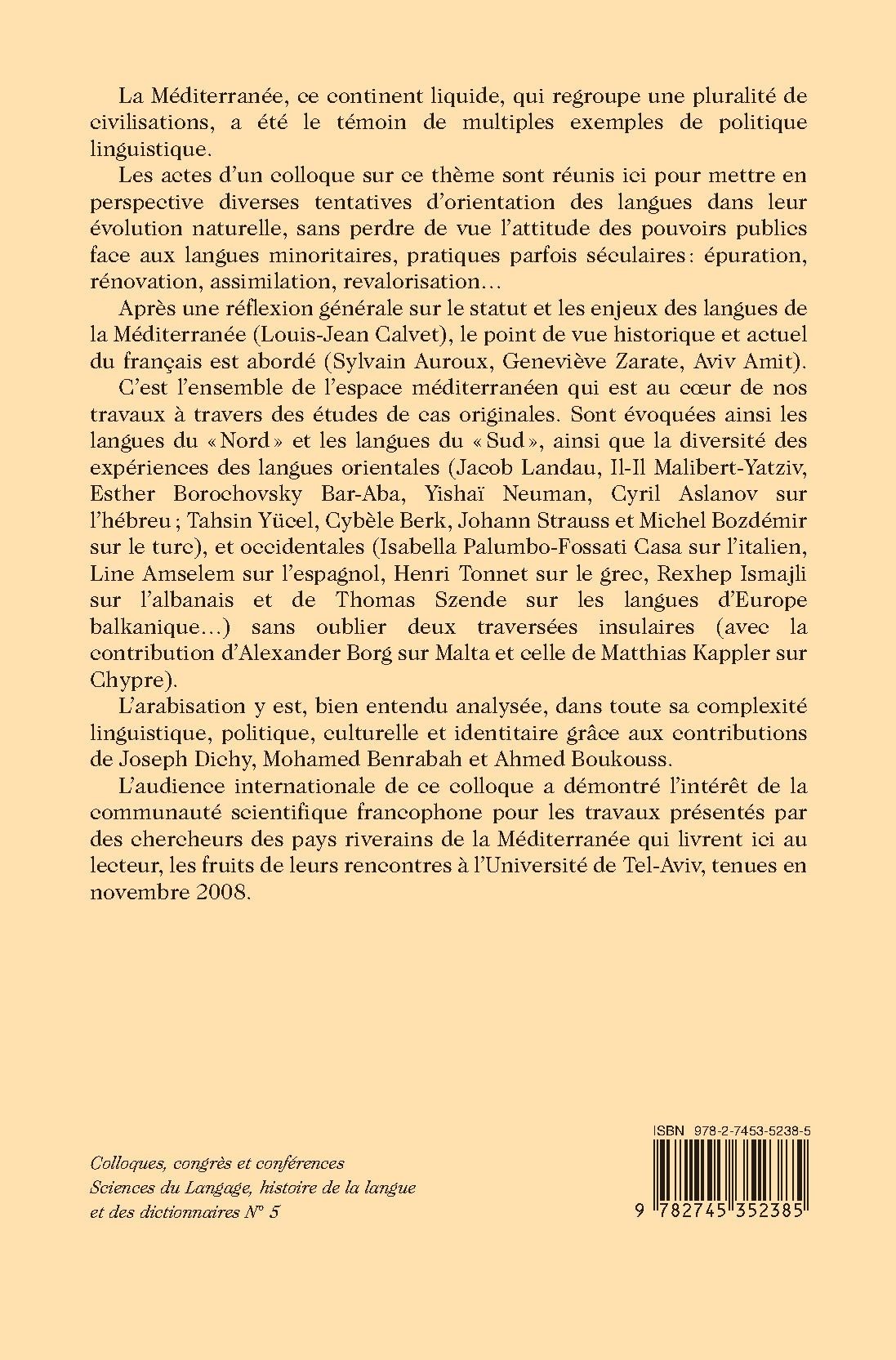 Après une réflexion générale sur le statut et les enjeux des langues de la Méditerranée (Louis-Jean Calvet), le point de vue historique et actuel du français est abordé (Sylvain Auroux, Geneviève Zarate, Aviv Amit).