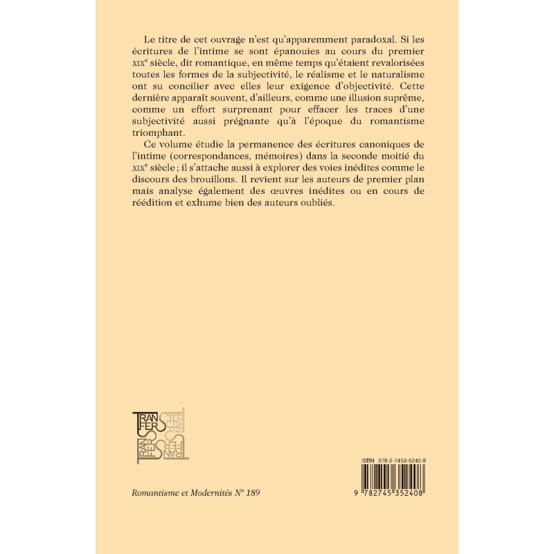 Le titre de cet ouvrage n’est qu’apparemment paradoxal. Si les écritures de l’intime se sont épanouies au cours du premier XIXe siècle, dit romantique, en même temps qu’étaient revalorisées toutes les formes de la subjectivité, le réalisme et le naturalisme ont su concilier avec elles leur exigence d’objectivité. Cette dernière apparaît souvent, d’ailleurs, comme une illusion suprême, comme un effort surprenant pour effacer les traces d’une subjectivité aussi prégnante qu’à l’époque du romantisme triomphant. Ce volume étudie la permanence des écritures canoniques de l’intime (correspondances, mémoires) dans la seconde moitié du XIXe siècle ; il s’attache aussi à explorer des voies inédites comme le discours des brouillons. Il revient sur les auteurs de premier plan mais analyse également des œuvres inédites ou en cours de réédition et exhume bien des auteurs oubliés.