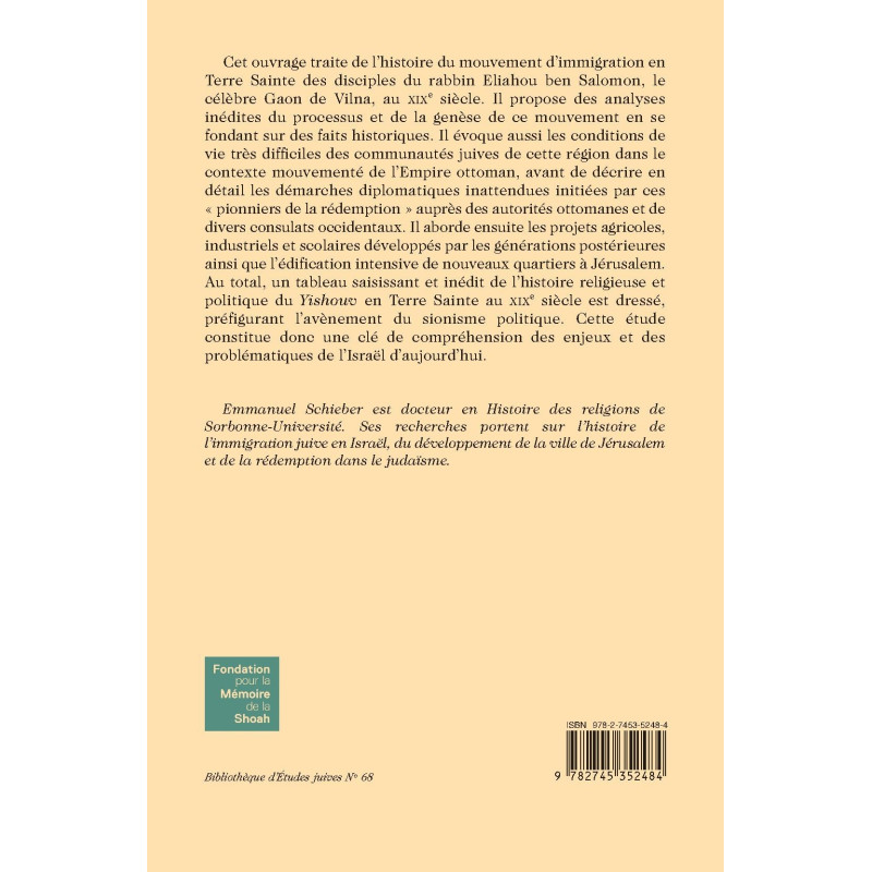 Cet ouvrage traite de l’histoire du mouvement d’immigration en Terre Sainte des disciples du rabbin Eliahou ben Salomon, le célèbre Gaon de Vilna, au XIXe siècle. Il propose des analyses inédites du processus et de la genèse de ce mouvement en se fondant sur des faits historiques. Il évoque aussi les conditions de vie très difficiles des communautés juives de cette région dans le contexte mouvementé de l’Empire ottoman, avant de décrire en détail les démarches diplomatiques inattendues initiées par ces « pionniers de la rédemption » auprès des autorités ottomanes et de divers consulats occidentaux. Il aborde ensuite les projets agricoles, industriels et scolaires développés par les générations postérieures ainsi que l’édification intensive de nouveaux quartiers à Jérusalem. Au total, un tableau saisissant et inédit de l’histoire religieuse et politique du Yishouv en Terre Sainte au XIXe siècle est dressé, préfigurant l’avènement du sionisme politique. Cette étude constitue donc une clé de compréhension des enjeux et des problématiques de l’Israël d’aujourd’hui.