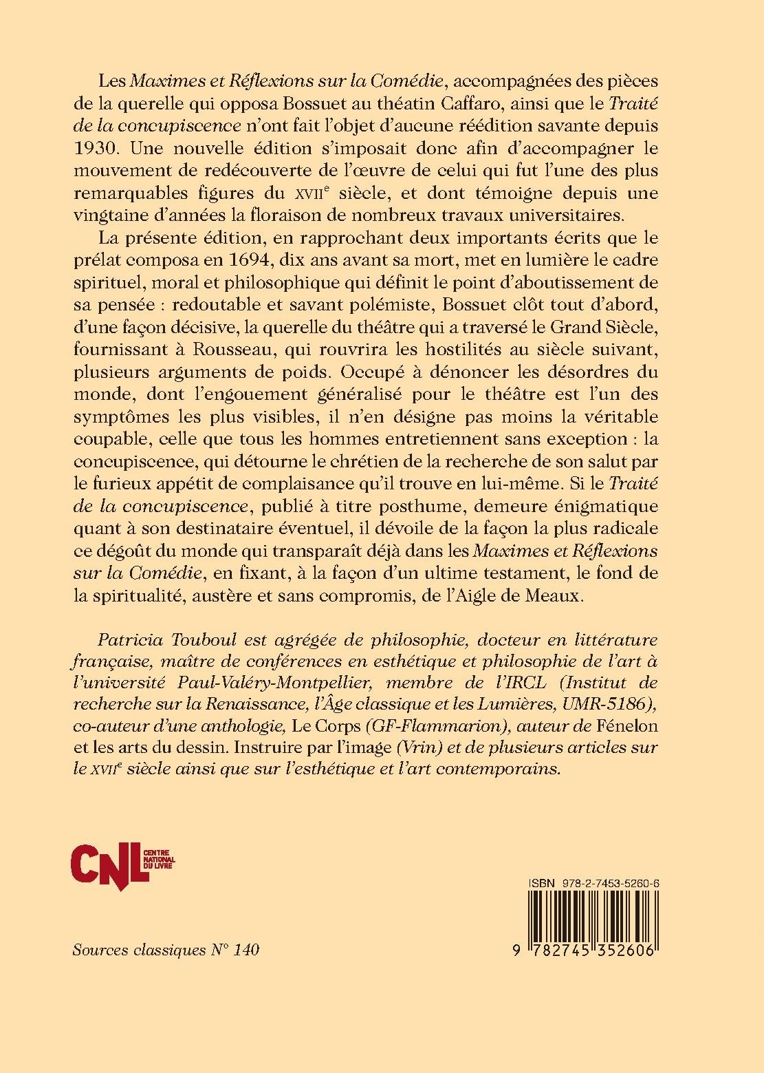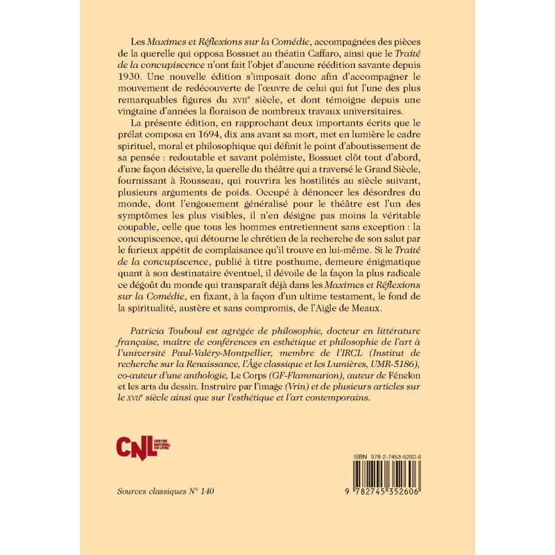 Les Maximes et Réflexions sur la Comédie, accompagnées des pièces de la querelle qui opposa Bossuet au théatin Caffaro, ainsi que le Traité de la concupiscence n’ont fait l’objet d’aucune réédition savante depuis 1930. Une nouvelle édition s’imposait donc afin d’accompagner le mouvement de redécouverte de l’oeuvre de celui qui fut l’une des plus remarquables figures du XVIIe siècle, et dont témoigne depuis une vingtaine d’années la floraison de nombreux travaux universitaires.