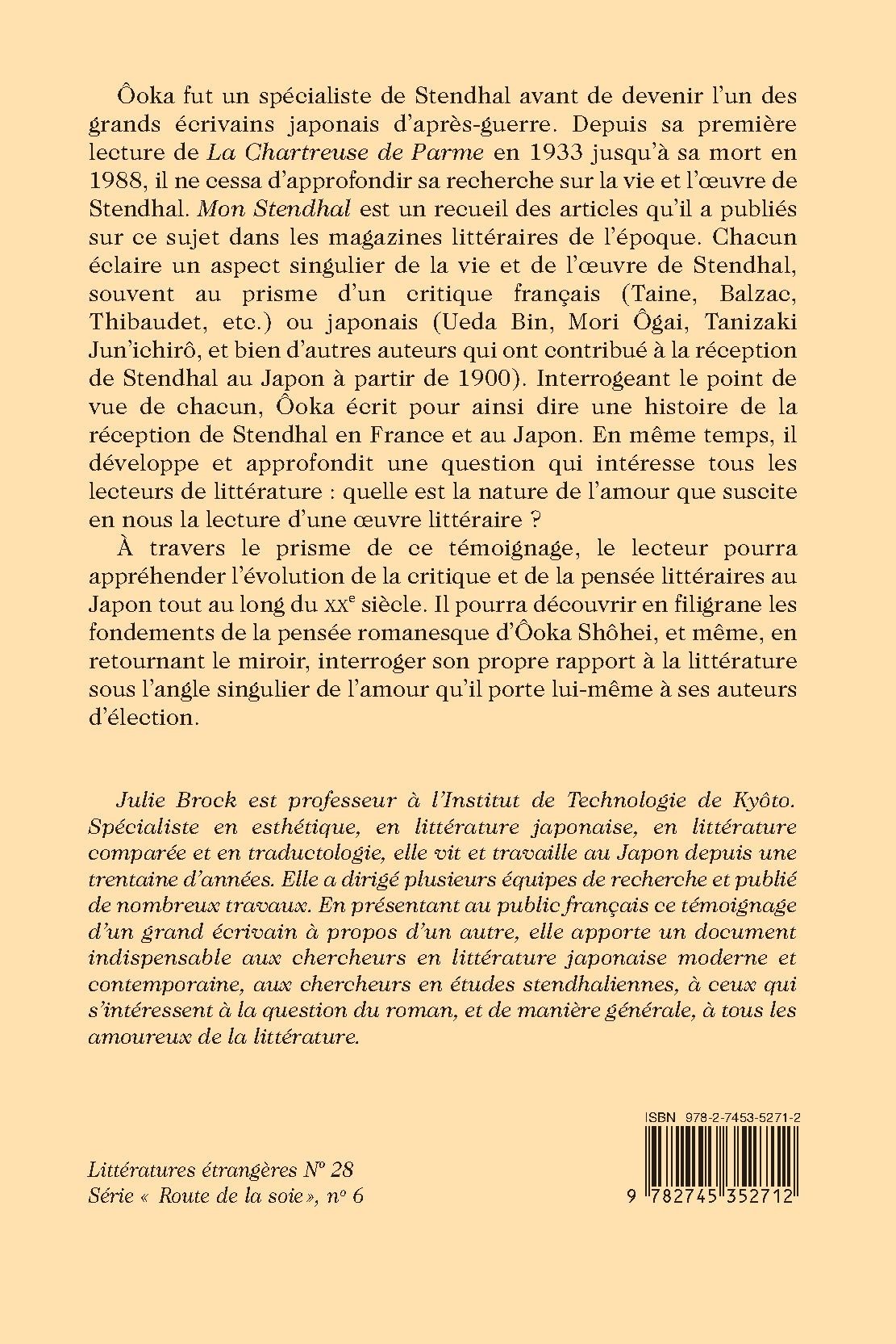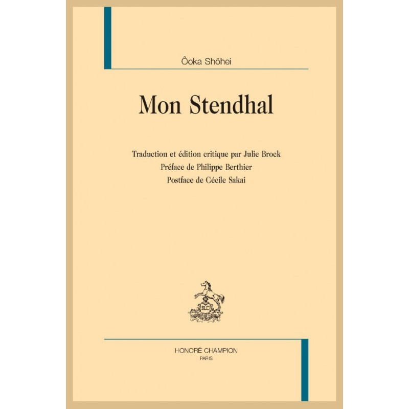 Ôoka fut un spécialiste de Stendhal avant de devenir l’un des grands écrivains japonais d’après-guerre. Depuis sa première lecture de La Chartreuse de Parme en 1933 jusqu’à sa mort en 1988, il ne cessa d’approfondir sa recherche sur la vie et l’oeuvre de Stendhal. Mon Stendhal est un recueil des articles qu’il a publiés sur ce sujet dans les magazines littéraires de l’époque. Chacun éclaire un aspect singulier de la vie et de l’oeuvre de Stendhal, souvent au prisme d’un critique français (Taine, Balzac, Thibaudet, etc.) ou japonais (Ueda Bin, Mori Ôgai, Tanizaki Jun’ichirô, et bien d’autres auteurs qui ont contribué à la réception de Stendhal au Japon à partir de 1900). Interrogeant le point de vue de chacun, Ôoka écrit pour ainsi dire une histoire de la réception de Stendhal en France et au Japon. En même temps, il développe et approfondit une question qui intéresse tous les lecteurs de littérature : quelle est la nature de l’amour que suscite en nous la lecture d’une oeuvre littéraire ?