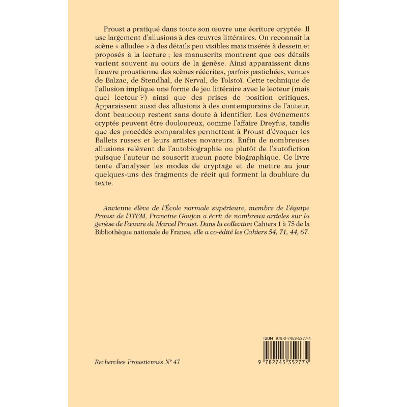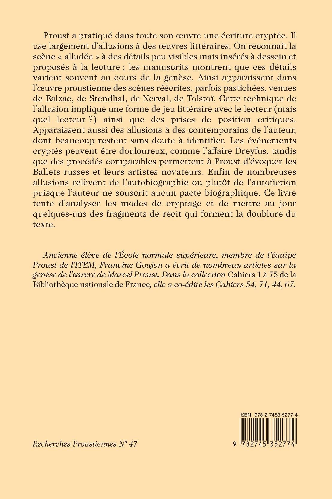 Proust a pratiqué dans toute son oeuvre une écriture cryptée. Il use largement d’allusions à des œuvres littéraires. On reconnaît la scène « alludée » à des détails peu visibles mais insérés à dessein et proposés à la lecture ; les manuscrits montrent que ces détails varient souvent au cours de la genèse. Ainsi apparaissent dans l’oeuvre proustienne des scènes réécrites, parfois pastichées, venues de Balzac, de Stendhal, de Nerval, de Tolstoï. Cette technique de l’allusion implique une forme de jeu littéraire avec le lecteur (mais quel lecteur ?) ainsi que des prises de position critiques. Apparaissent aussi des allusions à des contemporains de l’auteur, dont beaucoup restent sans doute à identifier. Les événements cryptés peuvent être douloureux, comme l’affaire Dreyfus, tandis que des procédés comparables permettent à Proust d’évoquer les Ballets russes et leurs artistes novateurs. Enfin de nombreuses allusions relèvent de l’autobiographie ou plutôt de l’autofiction puisque l’auteur ne souscrit aucun pacte biographique. Ce livre tente d’analyser les modes de cryptage et de mettre au jour quelques-uns des fragments de récit qui forment la doublure du texte.