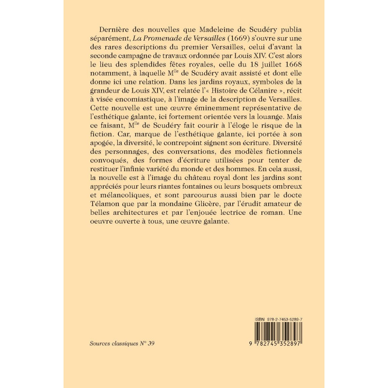 Dernière des nouvelles que Madeleine de Scudéry publia séparément, La Promenade de Versailles (1669) s’ouvre sur une des rares descriptions du premier Versailles, celui d’avant la seconde campagne de travaux ordonnée par Louis XIV. C’est alors le lieu des splendides fêtes royales, celle du 18 juillet 1668 notamment, à laquelle Mlle de Scudéry avait assisté et dont elle donne ici une relation. Dans les jardins royaux, symboles de la grandeur de Louis XIV, est relatée l’« Histoire de Célanire », récit à visée encomiastique, à l’image de la description de Versailles. Cette nouvelle est une œuvre éminemment représentative de l’esthétique galante, ici fortement orientée vers la louange. Mais ce faisant, Mlle de Scudéry fait courir à l’éloge le risque de la fiction. Car, marque de l’esthétique galante, ici portée à son apogée, la diversité, le contrepoint signent son écriture. Diversité des personnages, des conversations, des modèles fictionnels convoqués, des formes d’écriture utilisées pour tenter de restituer l’infinie variété du monde et des hommes. En cela aussi, la nouvelle est à l’image du château royal dont les jardins sont appréciés pour leurs riantes fontaines ou leurs bosquets ombreux et mélancoliques, et sont parcourus aussi bien par le docte Télamon que par la mondaine Glicère, par l’érudit amateur de belles architectures et par l’enjouée lectrice de roman. Une œuvre ouverte à tous, une œuvre galante.