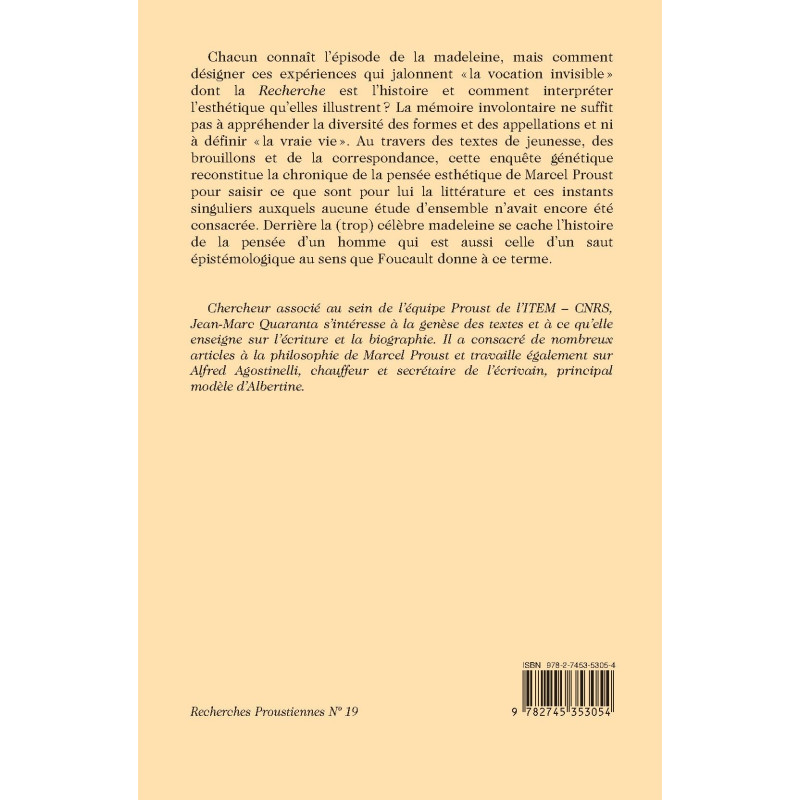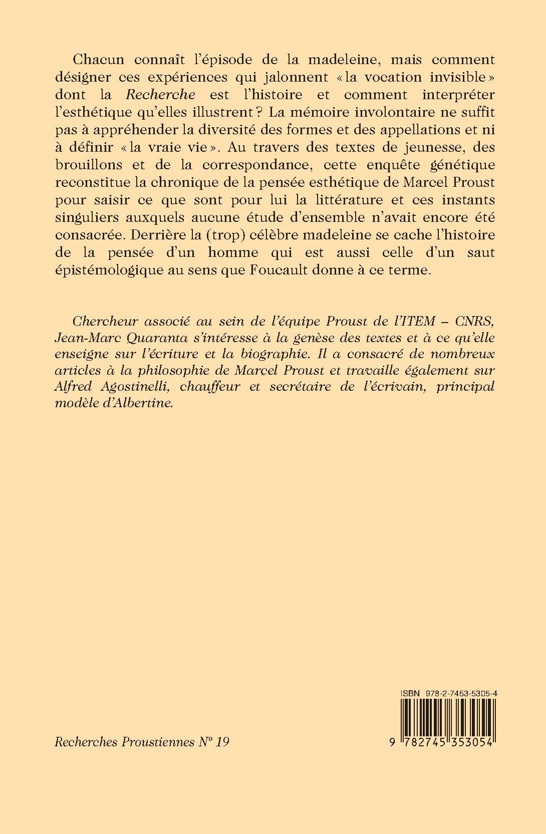 Chacun connaît l’épisode de la madeleine, mais comment désigner ces expériences qui jalonnent « la vocation invisible » dont la Recherche est l’histoire et comment interpréter l’esthétique qu’elles illustrent ? La mémoire involontaire ne suffit pas à appréhender la diversité des formes et des appellations et ni à définir « la vraie vie ». Au travers des textes de jeunesse, des brouillons et de la correspondance, cette enquête génétique reconstitue la chronique de la pensée esthétique de Marcel Proust pour saisir ce que sont pour lui la littérature et ces instants singuliers auxquels aucune étude d’ensemble n’avait encore été consacrée. Derrière la (trop) célèbre madeleine se cache l’histoire de la pensée d’un homme qui est aussi celle d’un saut épistémologique au sens que Foucault donne à ce terme.