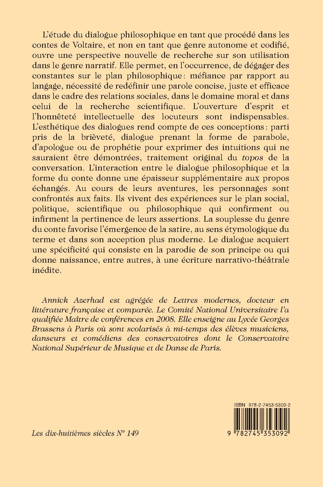 L’étude du dialogue philosophique en tant que procédé dans les contes de Voltaire, et non en tant que genre autonome et codifié, ouvre une perspective nouvelle de recherche sur son utilisation dans le genre narratif. Elle permet, en l’occurrence, de dégager des constantes sur le plan philosophique : méfiance par rapport au langage, nécessité de redéfinir une parole concise, juste et efficace dans le cadre des relations sociales, dans le domaine moral et dans celui de la recherche scientifique. L’ouverture d’esprit et l’honnêteté intellectuelle des locuteurs sont indispensables. L’esthétique des dialogues rend compte de ces conceptions : parti pris de la brièveté, dialogue prenant la forme de parabole, d’apologue ou de prophétie pour exprimer des intuitions qui ne sauraient être démontrées, traitement original du topos de la conversation. L’interaction entre le dialogue philosophique et la forme du conte donne une épaisseur supplémentaire aux propos échangés. Au cours de leurs aventures, les personnages sont confrontés aux faits. Ils vivent des expériences sur le plan social, politique, scientifique ou philosophique qui confirment ou infirment la pertinence de leurs assertions. La souplesse du genre du conte favorise l’émergence de la satire, au sens étymologique du terme et dans son acception plus moderne. Le dialogue acquiert une spécificité qui consiste en la parodie de son principe ou qui donne naissance, entre autres, à une écriture narrativo-théâtrale inédite.
