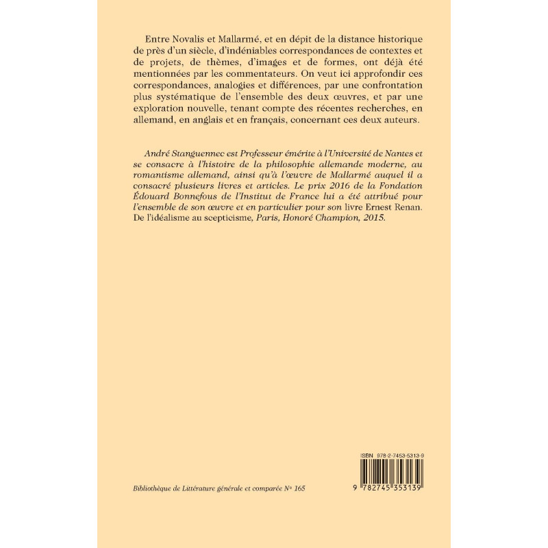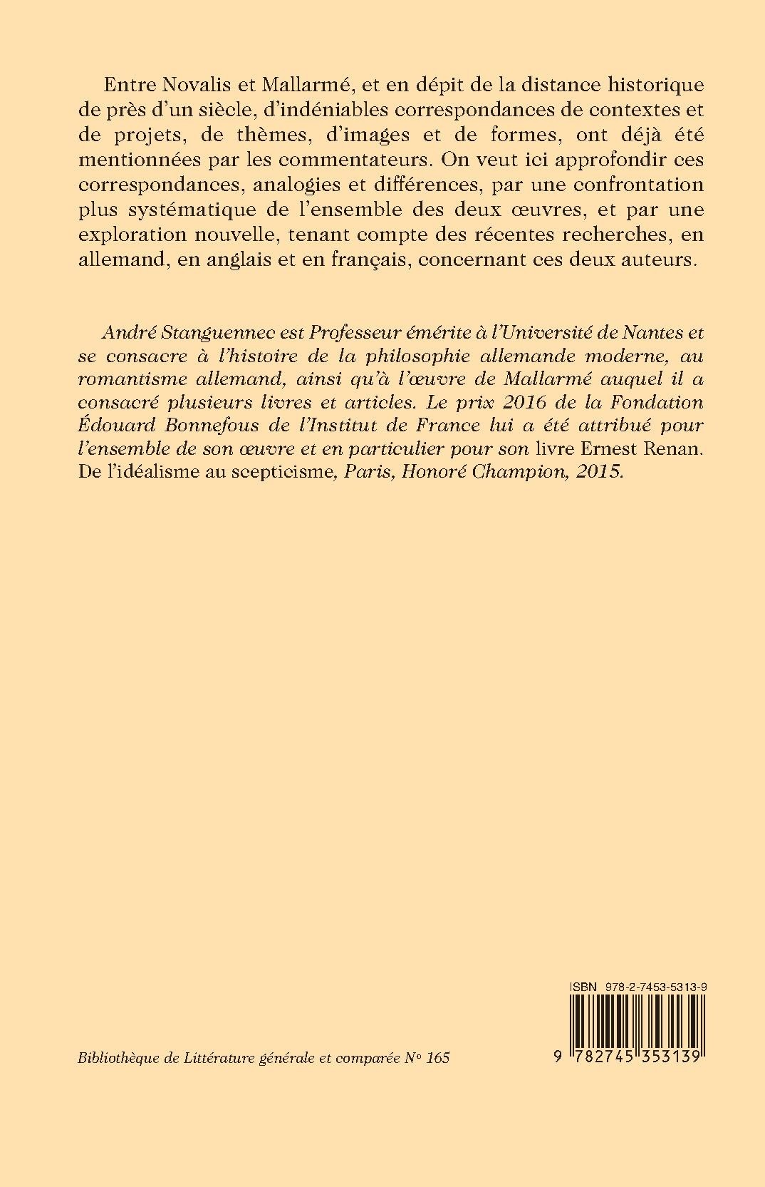 Entre Novalis et Mallarmé, et en dépit de la distance historique de près d’un siècle, d’indéniables correspondances de contextes et de projets, de thèmes, d’images et de formes, ont déjà été mentionnées par les commentateurs. On veut ici approfondir ces correspondances, analogies et différences, par une confrontation plus systématique de l’ensemble des deux œuvres, et par une exploration nouvelle, tenant compte des récentes recherches, en allemand, en anglais et en français, concernant ces deux auteurs.