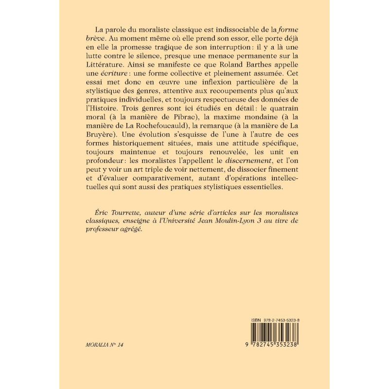 La parole du moraliste classique est indissociable de la forme brève. Au moment même où elle prend son essor, elle porte déjà en elle la promesse tragique de son interruption : il y a là une lutte contre le silence, presque une menace permanente sur la Littérature. Ainsi se manifeste ce que Roland Barthes appelle une écriture : une forme collective et pleinement assumée. Cet essai met donc en oeuvre une inflexion particulière de la stylistique des genres, attentive aux recoupements plus qu’aux pratiques individuelles, et toujours respectueuse des données de l’Histoire. Trois genres sont ici étudiés en détail : le quatrain moral (à la manière de Pibrac), la maxime mondaine (à la manière de La Rochefoucauld), la remarque (à la manière de La Bruyère). Une évolution s’esquisse de l’une à l’autre de ces formes historiquement situées, mais une attitude spécifique, toujours maintenue et toujours renouvelée, les unit en profondeur : les moralistes l’appellent le discernement, et l’on peut y voir un art triple de voir nettement, de dissocier finement et d’évaluer comparativement, autant d’opérations intellectuelles qui sont aussi des pratiques stylistiques essentielles.