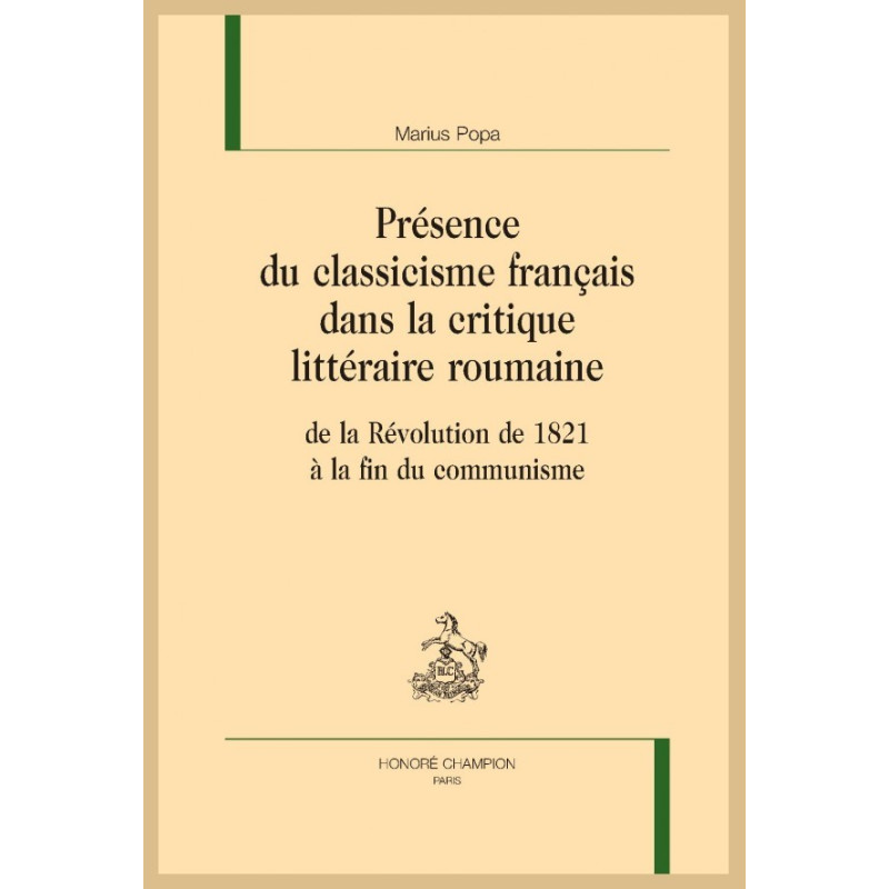 Cet ouvrage répertorie, analyse et interprète les références au classicisme français et le rôle qu’il a joué dans la critique littéraire roumaine, depuis la Révolution de Tudor Vladimirescu (1821) jusqu’à la chute du régime communiste (1989). Après avoir replacé la réception du modèle dans le cadre de l’histoire de la Roumanie et de ses relations politiques et intellectuelles avec la France, notamment par une étude de la traduction des classiques français en langue roumaine, suivie d’une analyse généalogique et esthétique du concept de « classicisme français », le volume restitue, dans le contexte de chaque grande époque de la modernité roumaine, puis, pour chacune de ces périodes, à travers l’étude plus spécifique de quelques écrivains et critiques choisis comme les plus représentatifs en cette matière, la persistance et le renouvellement de l’image du classicisme français, lui-même fréquemment perçu et analysé comme l’expression nationale d’un classicisme « universel ». Le cheminement chronologique permet de dégager les trois usages majeurs que la critique roumaine a faits de la référence à cette catégorie esthétique et historique : celui de modèle pour une création littéraire qui se cherchait, celui de critère pour son évaluation et celui d’enjeu dans le cadre des débats suscités par les courants nouveaux qui auront animé la vie littéraire roumaine depuis son émergence jusqu’à la presque fin du XXe siècle.