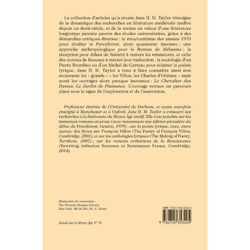 La collection d’articles qu’a réunie Jane H. M. Taylor témoigne de la dynamique des recherches en littérature médiévale tardive depuis un demi-siècle, et de la remise en valeur d’une littérature longtemps parente pauvre des études universitaires, grâce à des démarches critiques diverses : le structuralisme des années 1970 pour étudier le Perceforest, alors quasiment inconnu ; une approche anthropologique pour le Roman de Mélusine ; la réception pour Jehan de Saintré à travers les miniatures, et celle des œuvres de Boccace à travers leur traduction ; la sociologie d’un Pierre Bourdieu ou d’un Michel de Certeau pour éclairer la poésie lyrique. Jane H. M. Taylor a tenu à faire connaître ainsi non seulement les « grands » – les Villon, les Charles d’Orléans – mais aussi les ouvrages alors presque inconnus : Le Chevalier des Dames, Le Jardin de Plaisance. L’ouvrage retrace un parcours placé sous le signe de l’exploration et de l’innovation.