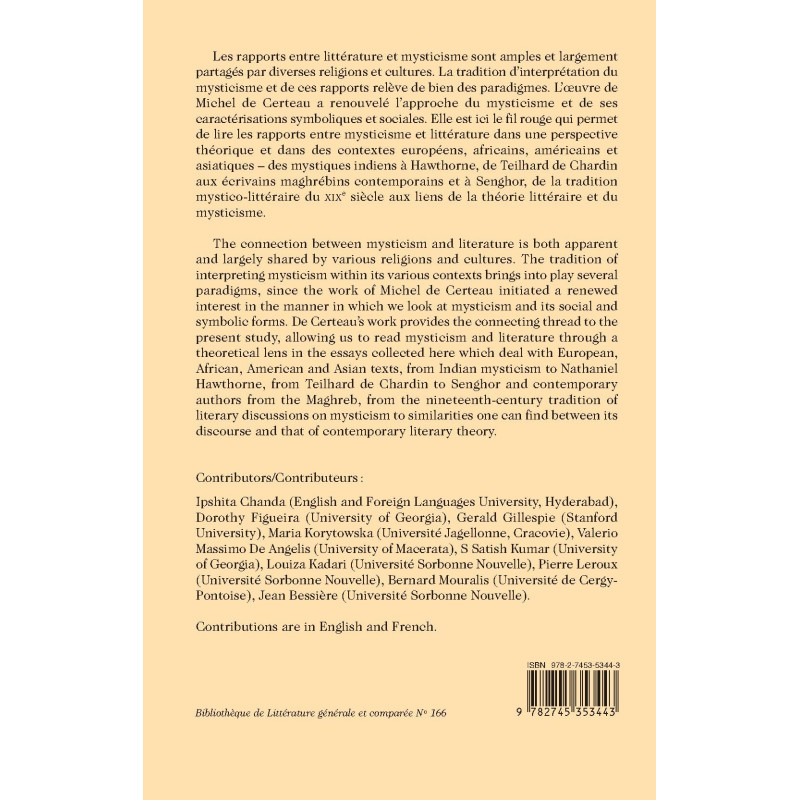 The connection between mysticism and literature is both apparent and largely shared by various religions and cultures. The tradition of interpreting mysticism within its various contexts brings into play several paradigms, since the work of Michel de Certeau initiated a renewed interest in the manner in which we look at mysticism and its social and symbolic forms. De Certeau’s work provides the connecting thread to the present study, allowing us to read mysticism and literature through a theoretical lens in the essays collected here which deal with European, African, American and Asian texts, from Indian mysticism to Nathaniel Hawthorne, from Teilhard de Chardin to Senghor and contemporary authors from the Maghreb, from the nineteenth-century tradition of literary discussions on mysticism to similarities one can find between its discourse and that of contemporary literary theory.