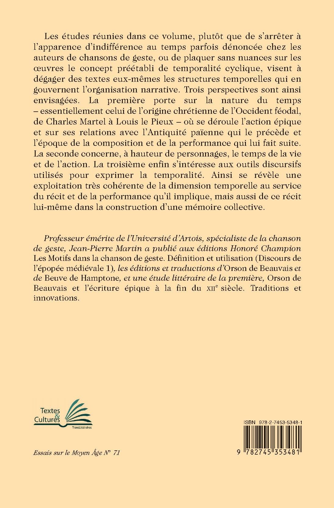 Les études réunies dans ce volume, plutôt que de s’arrêter à l’apparence d’indifférence au temps parfois dénoncée chez les auteurs de chansons de geste, ou de plaquer sans nuances sur les œuvres le concept préétabli de temporalité cyclique, visent à dégager des textes eux-mêmes les structures temporelles qui en gouvernent l’organisation narrative. Trois perspectives sont ainsi envisagées. La première porte sur la nature du temps – essentiellement celui de l’origine chrétienne de l’Occident féodal, de Charles Martel à Louis le Pieux – où se déroule l’action épique et sur ses relations avec l’Antiquité païenne qui le précède et l’époque de la composition et de la performance qui lui fait suite. La seconde concerne, à hauteur de personnages, le temps de la vie et de l’action. La troisième enfin s’intéresse aux outils discursifs utilisés pour exprimer la temporalité. Ainsi se révèle une exploitation très cohérente de la dimension temporelle au service du récit et de la performance qu’il implique, mais aussi de ce récit lui-même dans la construction d’une mémoire collective.