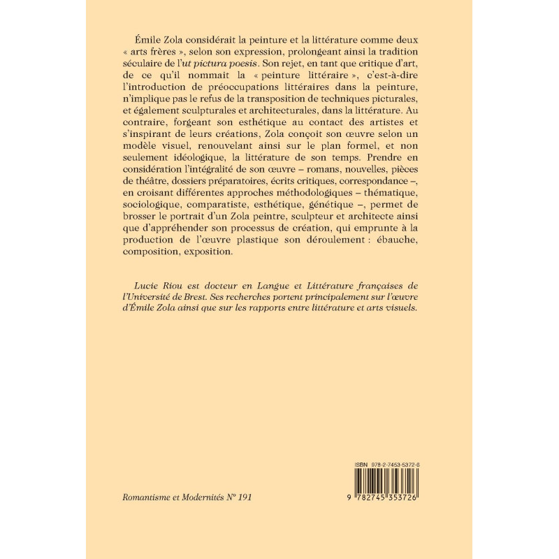 Émile Zola considérait la peinture et la littérature comme deux « arts frères », selon son expression, prolongeant ainsi la tradition séculaire de l’ut pictura poesis. Son rejet, en tant que critique d’art, de ce qu’il nommait la « peinture littéraire », c’est-à-dire l’introduction de préoccupations littéraires dans la peinture, n’implique pas le refus de la transposition de techniques picturales, et également sculpturales et architecturales, dans la littérature. Au contraire, forgeant son esthétique au contact des artistes et s’inspirant de leurs créations, Zola conçoit son oeuvre selon un modèle visuel, renouvelant ainsi sur le plan formel, et non seulement idéologique, la littérature de son temps. Prendre en considération l’intégralité de son œuvre – romans, nouvelles, pièces de théâtre, dossiers préparatoires, écrits critiques, correspondance –, en croisant différentes approches méthodologiques – thématique, sociologique, comparatiste, esthétique, génétique –, permet de brosser le portrait d’un Zola peintre, sculpteur et architecte ainsi que d’appréhender son processus de création, qui emprunte à la production de l’œuvre plastique son déroulement : ébauche, composition, exposition.