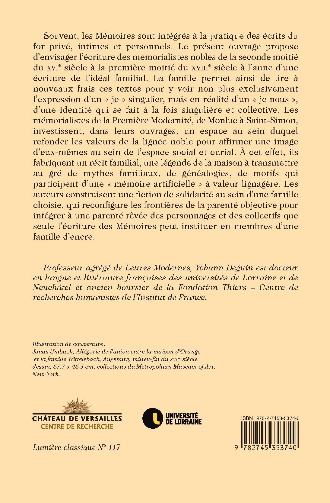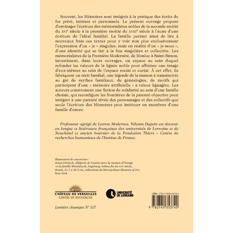 Souvent, les Mémoires sont intégrés à la pratique des écrits du for privé, intimes et personnels. Le présent ouvrage propose d’envisager l’écriture des mémorialistes nobles de la seconde moitié du XVIe siècle à la première moitié du XVIIIe siècle à l’aune d’une écriture de l’idéal familial. La famille permet ainsi de lire à nouveaux frais ces textes pour y voir non plus exclusivement l’expression d’un « je » singulier, mais en réalité d’un « je-nous », d’une identité qui se fait à la fois singulière et collective. Les mémorialistes de la Première Modernité, de Monluc à Saint-Simon, investissent, dans leurs ouvrages, un espace au sein duquel refonder les valeurs de la lignée noble pour affirmer une image d’eux-mêmes au sein de l’espace social et curial. À cet effet, ils fabriquent un récit familial, une légende de la maison à transmettre au gré de mythes familiaux, de généalogies, de motifs qui participent d’une « mémoire artificielle » à valeur lignagère. Les auteurs construisent une fiction de solidarité au sein d’une famille choisie, qui reconfigure les frontières de la parenté objective pour intégrer à une parenté rêvée des personnages et des collectifs que seule l’écriture des Mémoires peut instituer en membres d’une famille d’encre.