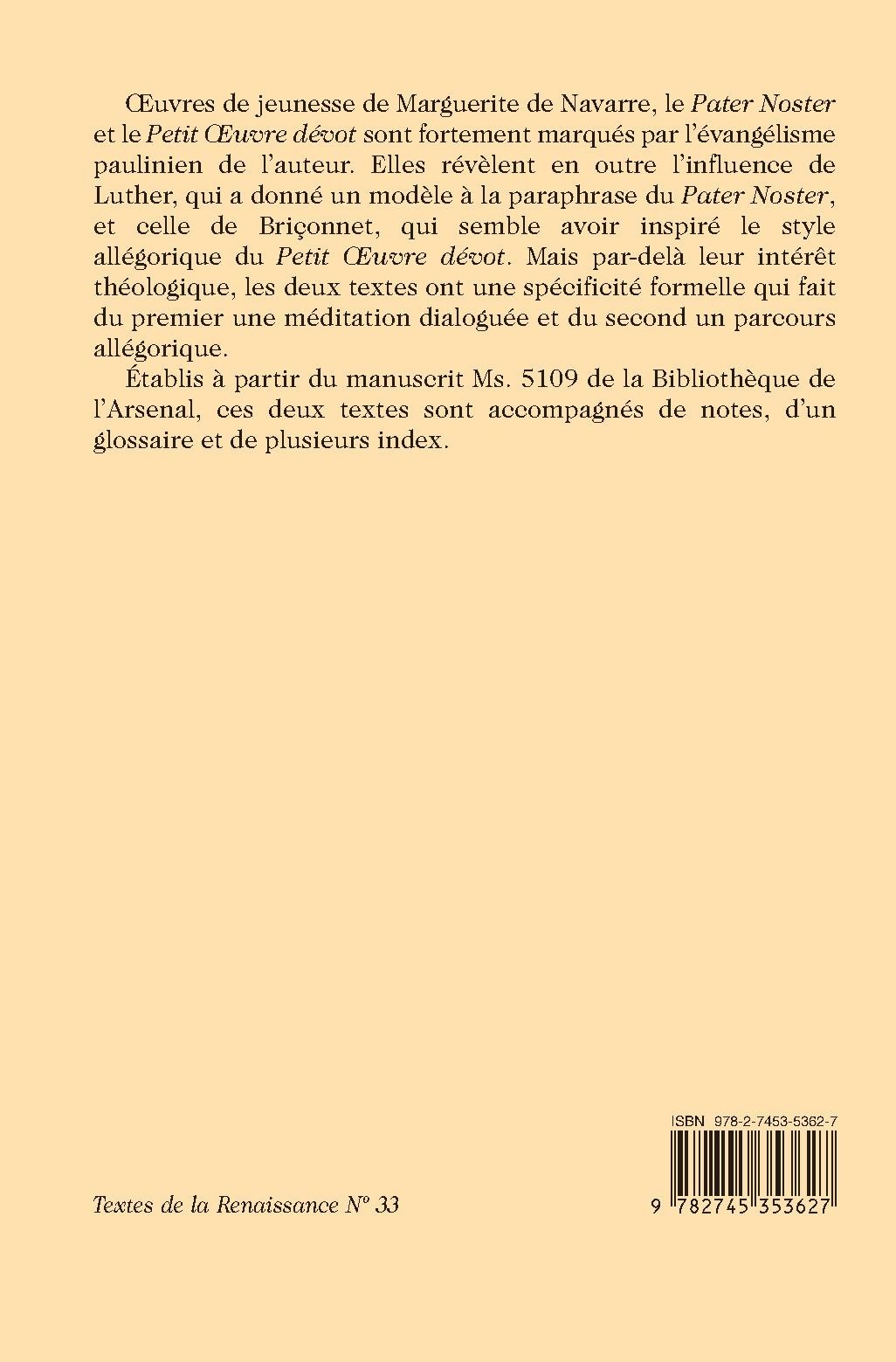 Oeuvres de jeunesse de Marguerite de Navarre, le Pater Noster et le Petit OEuvre dévot sont fortement marqués par l’évangélisme paulinien de l’auteur. Elles révèlent en outre l’influence de Luther, qui a donné un modèle à la paraphrase du Pater Noster, et celle de Briçonnet, qui semble avoir inspiré le style allégorique du Petit OEuvre dévot. Mais par-delà leur intérêt théologique, les deux textes ont une spécificité formelle qui fait du premier une méditation dialoguée et du second un parcours allégorique.