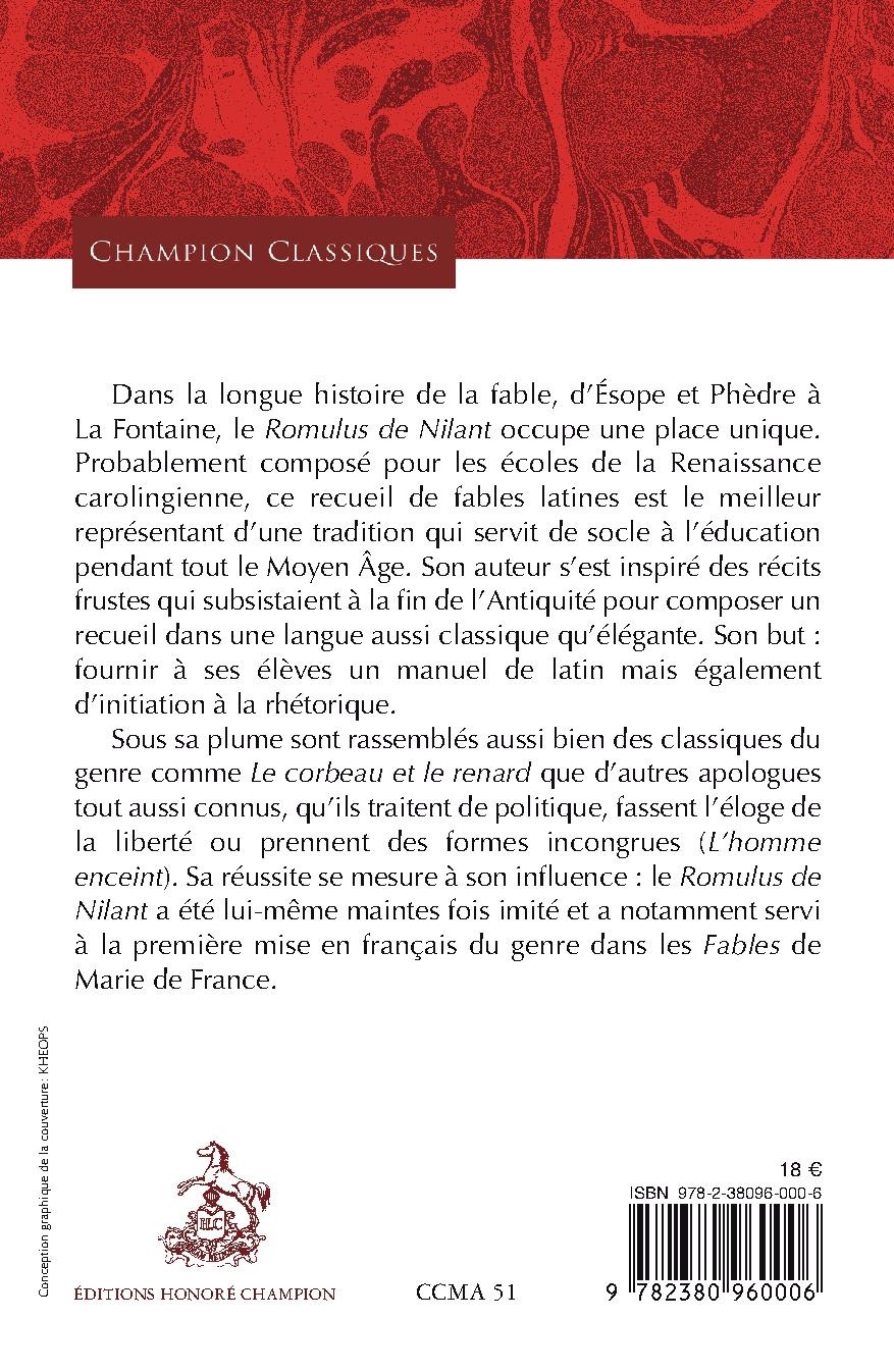 Dans la longue histoire de la fable, d’Ésope et Phèdre à La Fontaine, le Romulus de Nilant occupe une place unique. Probablement composé pour les écoles de la Renaissance carolingienne, ce recueil de fables latines est le meilleur représentant d’une tradition qui servit de socle à l’éducation pendant tout le Moyen Âge. Son auteur s’est inspiré des récits frustes qui subsistaient à la fin de l’Antiquité pour composer un recueil dans une langue aussi classique qu’élégante. Son but : fournir à ses élèves un manuel de latin mais également d’initiation à la rhétorique.