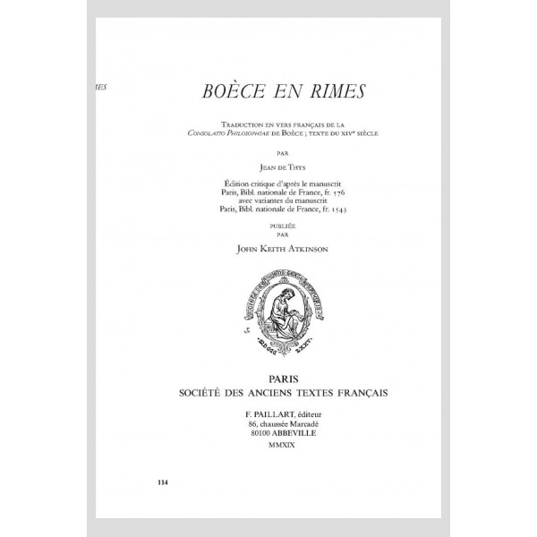 Est ici éditée l’une des traductions françaises de la Consolatio Philosophiae de Boèce. Attribuable à Jean de Thys, elle fut rédigée en octosyllabes à rimes plates vers 1350-1375 en Wallonie orientale. Son rédacteur y interpole des extraits de diverses sources latines, depuis Fulgence jusqu’aux commentaires latins de la Consolatio. Il affirme avoir traduit en conciliant respect pour la pensée de Boèce et volonté de faire briller la versification. Le texte ainsi produit est ardu, aussi conseille-t-il à ses lecteurs de lire parallèlement sa source latine.