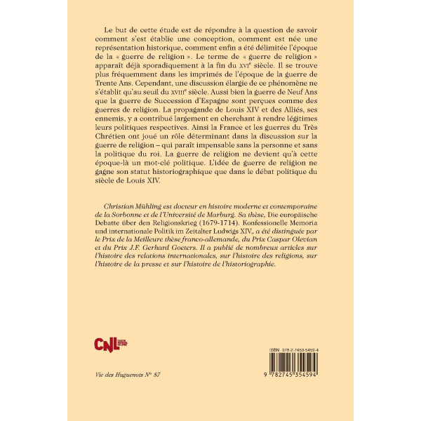 Christian Mühling est docteur en histoire moderne et contemporaine de la Sorbonne et de l’Université de Marburg. Sa thèse, Die europäische Debatte über den Religionskrieg (1679-1714). Konfessionelle Memoria und internationale Politik im Zeitalter Ludwigs XIV., a été distinguée par le Prix de la Meilleure thèse franco-allemande, du Prix Caspar Olevian et du Prix J.F. Gerhard Goeters. Il a publié de nombreux articles sur l’histoire des relations internationales, sur l’histoire des religions, sur l’histoire de la presse et sur l’histoire de l’historiographie.