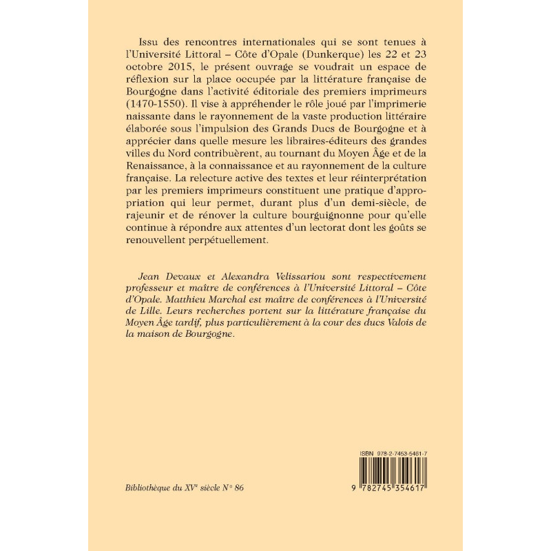 Jean Devaux et Alexandra Velissariou sont respectivement professeur et maître de conférences à l’Université Littoral – Côte d’Opale. Matthieu Marchal est maître de conférences à l’Université de Lille. Leurs recherches portent sur la littérature française du Moyen Âge tardif, plus particulièrement à la cour des ducs Valois de la maison de Bourgogne.