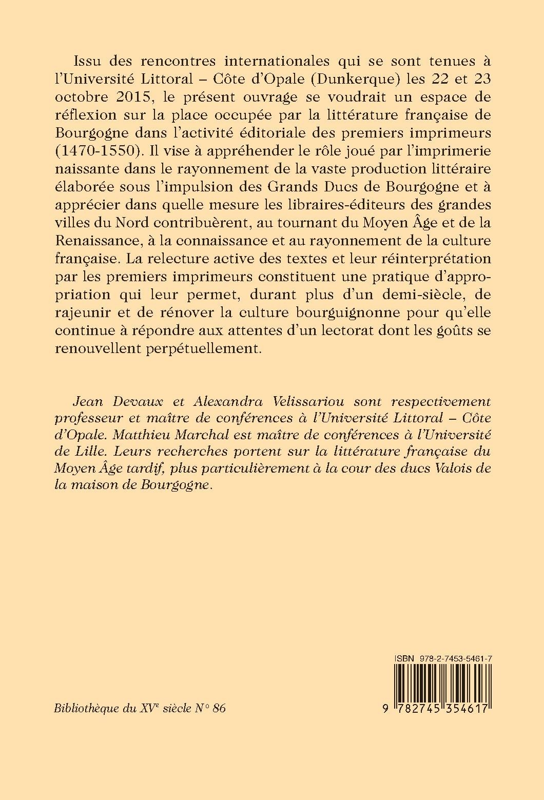 Issu des rencontres internationales qui se sont tenues à l’Université Littoral – Côte d’Opale (Dunkerque) les 22 et 23 octobre 2015, le présent ouvrage se voudrait un espace de réflexion sur la place occupée par la littérature française de Bourgogne dans l’activité éditoriale des premiers imprimeurs (1470-1550). Il vise à appréhender le rôle joué par l’imprimerie naissante dans le rayonnement de la vaste production littéraire élaborée sous l’impulsion des Grands Ducs de Bourgogne et à apprécier dans quelle mesure les libraires-éditeurs des grandes villes du Nord contribuèrent, au tournant du Moyen Âge et de la Renaissance, à la connaissance et au rayonnement de la culture française. La relecture active des textes et leur réinterprétation par les premiers imprimeurs constituent une pratique d’appropriation qui leur permet, durant plus d’un demi-siècle, de rajeunir et de rénover la culture bourguignonne pour qu’elle continue à répondre aux attentes d’un lectorat dont les goûts se renouvellent perpétuellement.