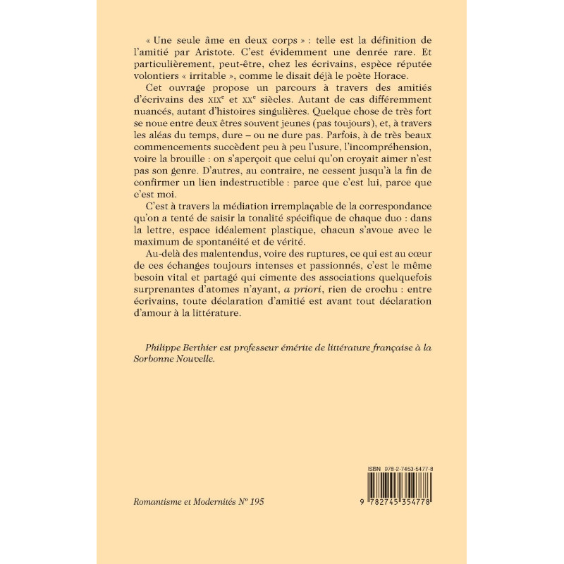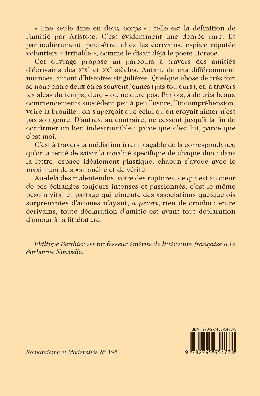 Cet ouvrage propose un parcours à travers des amitiés d’écrivains des XIXe et XXe siècles. Autant de cas différemment nuancés, autant d’histoires singulières. Quelque chose de très fort se noue entre deux êtres souvent jeunes (pas toujours), et, à travers les aléas du temps, dure – ou ne dure pas. Parfois, à de très beaux commencements succèdent peu à peu l’usure, l’incompréhension, voire la brouille : on s’aperçoit que celui qu’on croyait aimer n’est pas son genre. D’autres, au contraire, ne cessent jusqu’à la fin de confirmer un lien indestructible : parce que c’est lui, parce que c’est moi.