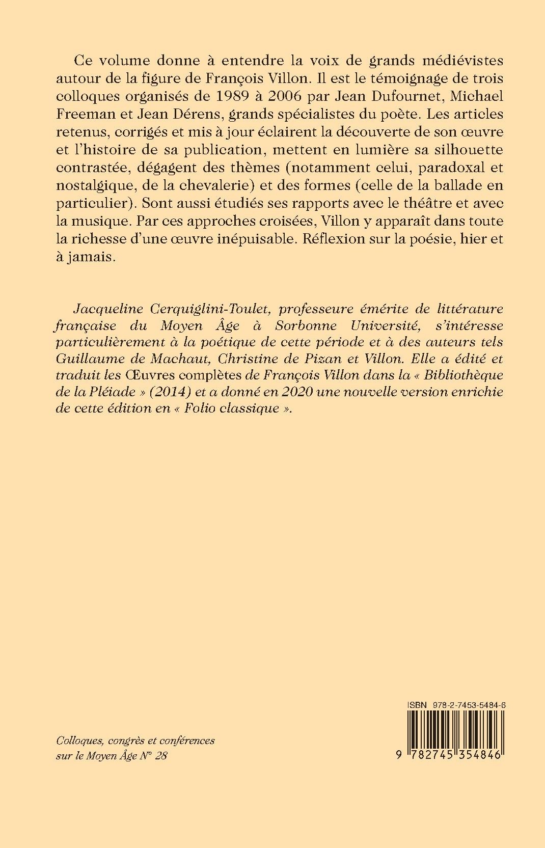 Ce volume donne à entendre la voix de grands médiévistes autour de la figure de François Villon. Il est le témoignage de trois colloques organisés de 1989 à 2006 par Jean Dufournet, Michael Freeman et Jean Dérens, grands spécialistes du poète. Les articles retenus, corrigés et mis à jour éclairent la découverte de son oeuvre et l’histoire de sa publication, mettent en lumière sa silhouette contrastée, dégagent des thèmes (notamment celui, paradoxal et nostalgique, de la chevalerie) et des formes (celle de la ballade en particulier). Sont aussi étudiés ses rapports avec le théâtre et avec la musique. Par ces approches croisées, Villon y apparaît dans toute la richesse d’une œuvre inépuisable. Réflexion sur la poésie, hier et à jamais.