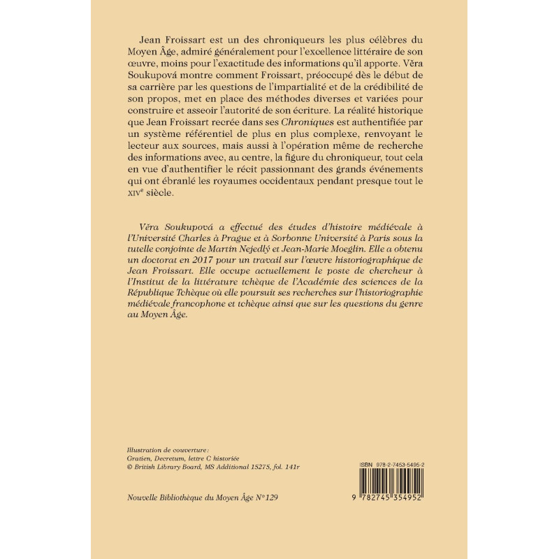 Jean Froissart est un des chroniqueurs les plus célèbres du Moyen Âge, admiré généralement pour l’excellence littéraire de son oeuvre, moins pour l’exactitude des informations qu’il apporte. Věra Soukupová montre comment Froissart, préoccupé dès le début de sa carrière par les questions de l’impartialité et de la crédibilité de son propos, met en place des méthodes diverses et variées pour construire et asseoir l’autorité de son écriture. La réalité historique que Jean Froissart recrée dans ses Chroniques est authentifiée par un système référentiel de plus en plus complexe, renvoyant le lecteur aux sources, mais aussi à l’opération même de recherche des informations avec, au centre, la figure du chroniqueur, tout cela en vue d’authentifier le récit passionnant des grands événements qui ont ébranlé les royaumes occidentaux pendant presque tout le XIVe siècle.