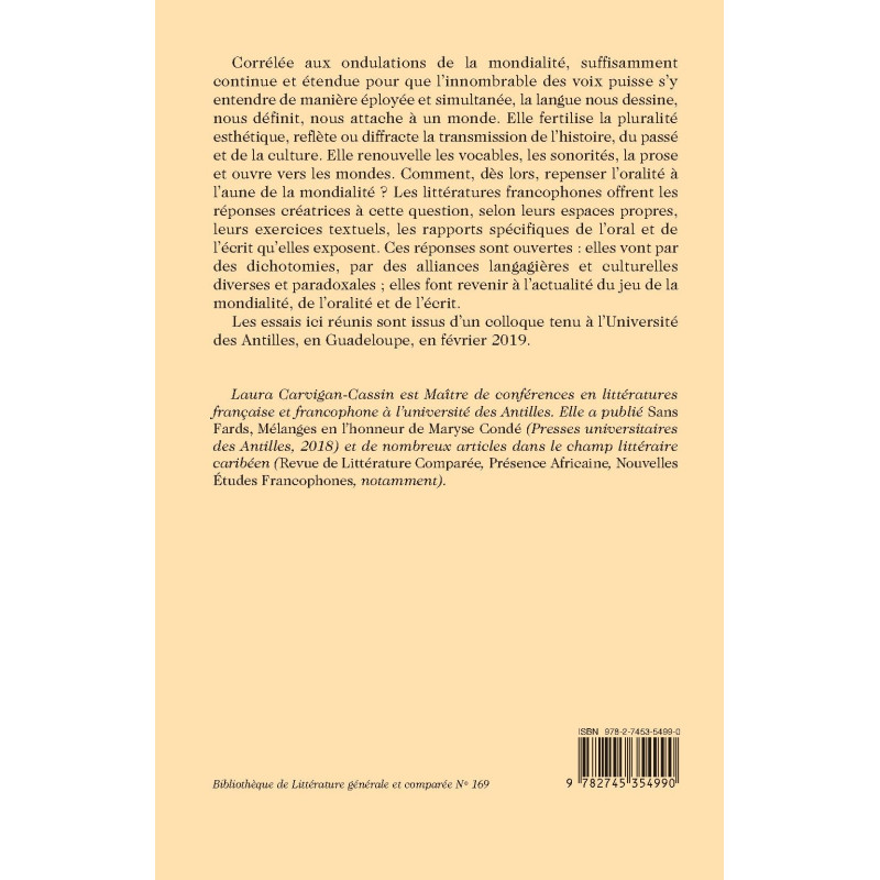 Corrélée aux ondulations de la mondialité, suffisamment continue et étendue pour que l’innombrable des voix puisse s’y entendre de manière éployée et simultanée, la langue nous dessine, nous définit, nous attache à un monde. Elle fertilise la pluralité esthétique, reflète ou diffracte la transmission de l’histoire, du passé et de la culture. Elle renouvelle les vocables, les sonorités, la prose et ouvre vers les mondes. Comment, dès lors, repenser l’oralité à l’aune de la mondialité ? Les littératures francophones offrent les réponses créatrices à cette question, selon leurs espaces propres, leurs exercices textuels, les rapports spécifiques de l’oral et de l’écrit qu’elles exposent. Ces réponses sont ouvertes : elles vont par des dichotomies, par des alliances langagières et culturelles diverses et paradoxales ; elles font revenir à l’actualité du jeu de la mondialité, de l’oralité et de l’écrit.