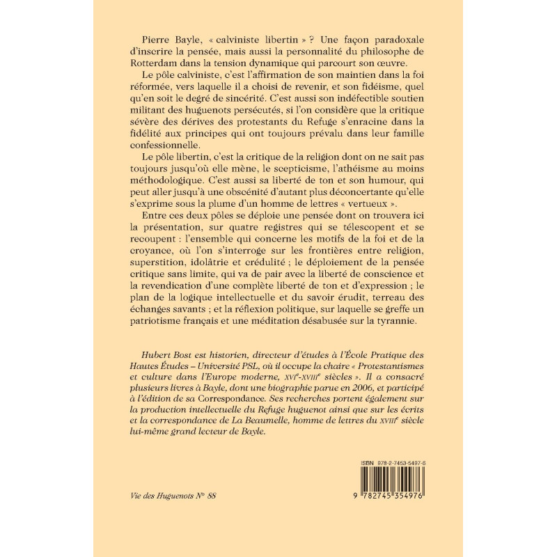 Hubert Bost est historien, directeur d’études à l’École Pratique des Hautes Études – Université PSL, où il occupe la chaire « Protestantismes et culture dans l’Europe moderne, XVIe-XVIIIe siècles ». Il a consacré plusieurs livres à Bayle, dont une biographie parue en 2006, et participé à l’édition de sa Correspondance. Ses recherches portent également sur la production intellectuelle du Refuge huguenot ainsi que sur les écrits et la correspondance de La Beaumelle, homme de lettres du XVIIIe siècle lui-même grand lecteur de Bayle.
