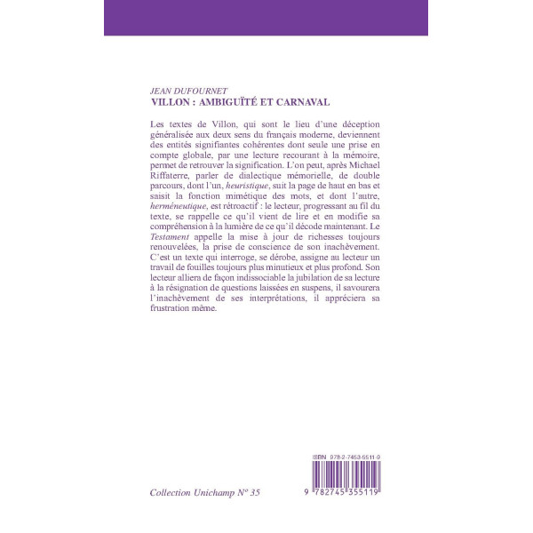Les textes de Villon, qui sont le lieu d’une déception généralisée aux deux sens du français moderne, deviennent des entités signifiantes cohérentes dont seule une prise en compte globale, par une lecture recourant à la mémoire, permet de retrouver la signification. L’on peut, après Michael Riffaterre, parler de dialectique mémorielle, de double parcours, dont l’un, heuristique, suit la page de haut en bas et saisit la fonction mimétique des mots, et dont l’autre, herméneutique, est rétroactif : le lecteur, progressant au fil du texte, se rappelle ce qu’il vient de lire et en modifie sa compréhension à la lumière de ce qu’il décode maintenant. Le Testament appelle la mise à jour de richesses toujours renouvelées, la prise de conscience de son inachèvement. C’est un texte qui interroge, se dérobe, assigne au lecteur un travail de fouilles toujours plus minutieux et plus profond. Son lecteur alliera de façon indissociable la jubilation de sa lecture à la résignation de questions laissées en suspens, il savourera l’inachèvement de ses interprétations, il appréciera sa frustration même.