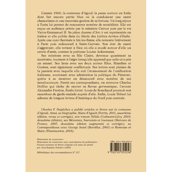 Charles F. Dupêchez a publié articles et livres sur la comtesse d’Agoult. Ainsi, sa biographie, Marie d’Agoult (Perrin, 2011, quatrième édition, revue et corrigée), son roman Nélida (Calmann-Lévy, 2010, deuxième édition), ses Mémoires, Souvenirs et Journaux (Mercure de France, 2007, deuxième édition augmentée et corrigée), sa Correspondance avec George Sand (Bartillat, 2001) et Hortense et Marie (Flammarion, 2018).