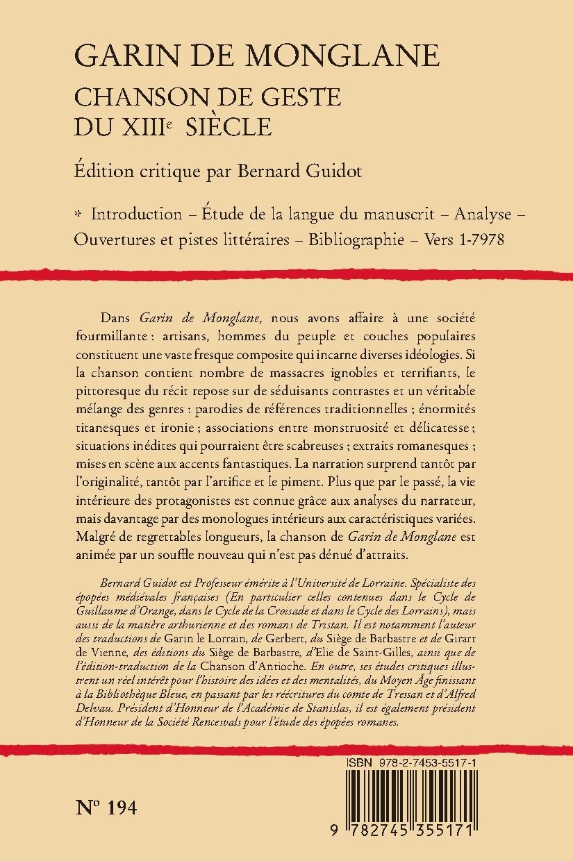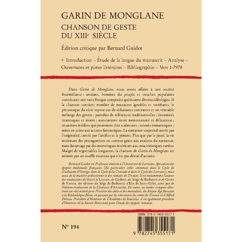 Bernard Guidot est Professeur émérite à l’Université de Lorraine. Spécialiste des épopées médiévales françaises (En particulier celles contenues dans le Cycle de Guillaume d’Orange, dans le Cycle de la Croisade et dans le Cycle des Lorrains), mais aussi de la matière arthurienne et des romans de Tristan. Il est notamment l’auteur des traductions de Garin le Lorrain, de Gerbert, du Siège de Barbastre et de Girart de Vienne, des éditions du Siège de Barbastre, d’Elie de Saint-Gilles, ainsi que de l’édition-traduction de la Chanson d’Antioche. En outre, ses études critiques illustrent un réel intérêt pour l’histoire des idées et des mentalités, du Moyen Âge finissant à la Bibliothèque Bleue, en passant par les réécritures du comte de Tressan et d’Alfred Delvau. Président d’Honneur de l’Académie de Stanislas, il est également président d’Honneur de la Société Rencesvals pour l’étude des épopées romanes.