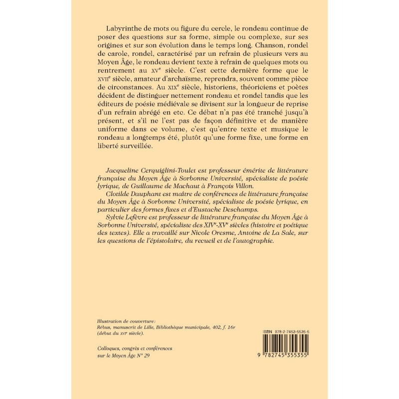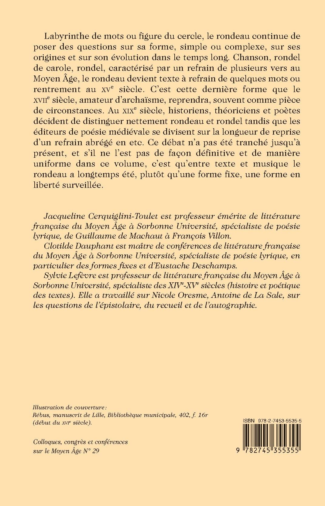 Labyrinthe de mots ou figure du cercle, le rondeau continue de poser des questions sur sa forme, simple ou complexe, sur ses origines et sur son évolution dans le temps long. Chanson, rondel de carole, rondel, caractérisé par un refrain de plusieurs vers au Moyen Âge, le rondeau devient texte à refrain de quelques mots ou rentrement au XVe siècle. C’est cette dernière forme que le XVIIe siècle, amateur d’archaïsme, reprendra, souvent comme pièce de circonstances. Au XIXe siècle, historiens, théoriciens et poètes décident de distinguer nettement rondeau et rondel tandis que les éditeurs de poésie médiévale se divisent sur la longueur de reprise d’un refrain abrégé en etc. Ce débat n’a pas été tranché jusqu’à présent, et s’il ne l’est pas de façon définitive et de manière uniforme dans ce volume, c’est qu’entre texte et musique le rondeau a longtemps été, plutôt qu’une forme fixe, une forme en liberté surveillée.