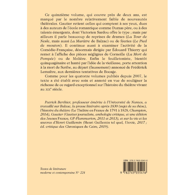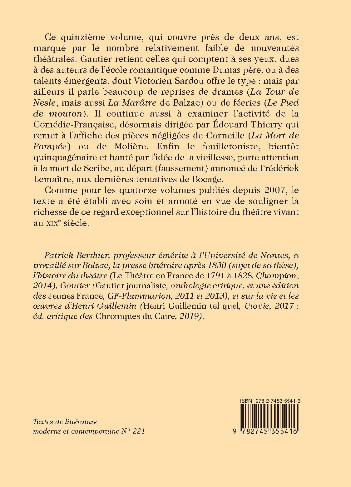 Ce quinzième volume, qui couvre près de deux ans, est marqué par le nombre relativement faible de nouveautés théâtrales. Gautier retient celles qui comptent à ses yeux, dues à des auteurs de l’école romantique comme Dumas père, ou à des talents émergents, dont Victorien Sardou offre le type ; mais par ailleurs il parle beaucoup de reprises de drames (La Tour de Nesle, mais aussi La Marâtre de Balzac) ou de féeries (Le Pied de mouton). Il continue aussi à examiner l’activité de la Comédie-Française, désormais dirigée par Édouard Thierry qui remet à l’affiche des pièces négligées de Corneille (La Mort de Pompée) ou de Molière. Enfin le feuilletoniste, bientôt quinquagénaire et hanté par l’idée de la vieillesse, porte attention à la mort de Scribe, au départ (faussement) annoncé de Frédérick Lemaître, aux dernières tentatives de Bocage.