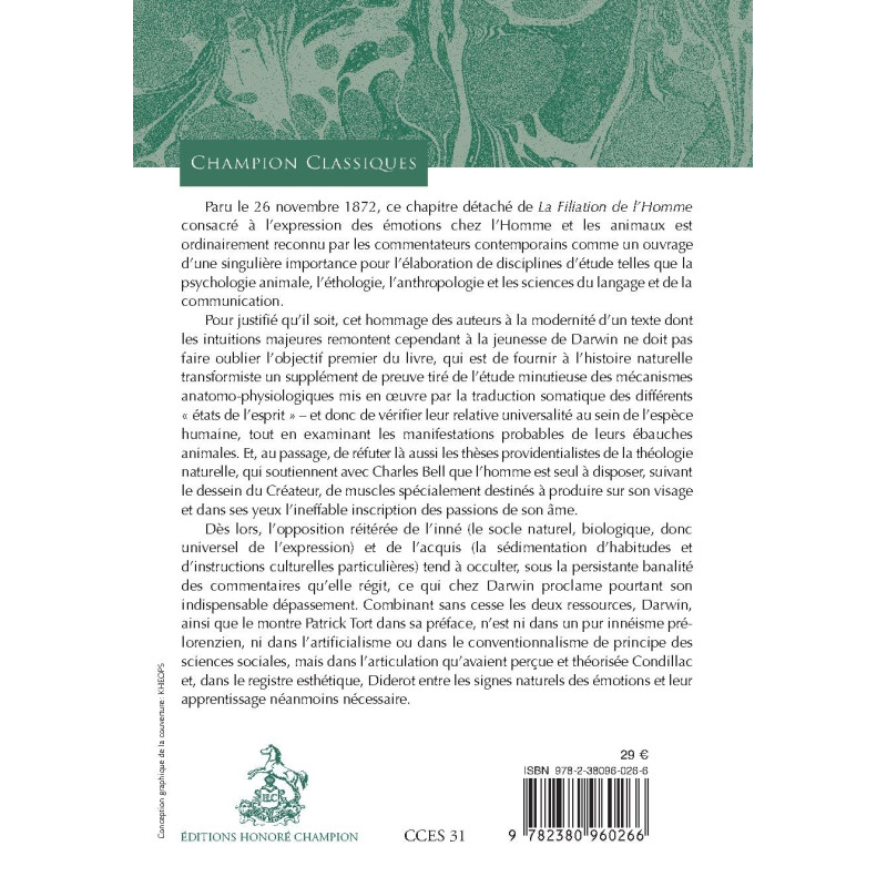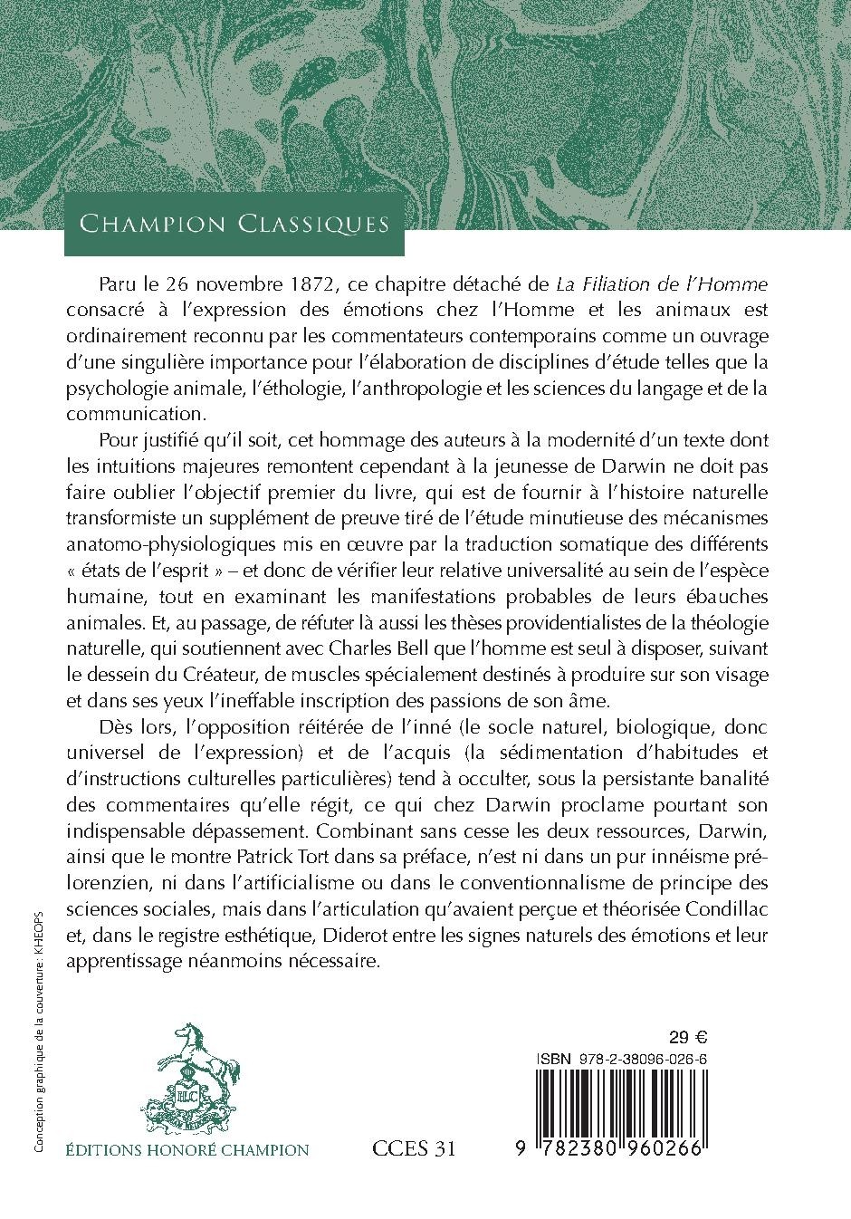 Paru le 26 novembre 1872, ce chapitre détaché de La Filiation de l’Homme consacré à l’expression des émotions chez l’Homme et les animaux est ordinairement reconnu par les commentateurs contemporains comme un ouvrage d’une singulière importance pour l’élaboration de disciplines d’étude telles que la psychologie animale, l’éthologie, l’anthropologie et les sciences du langage et de la communication.