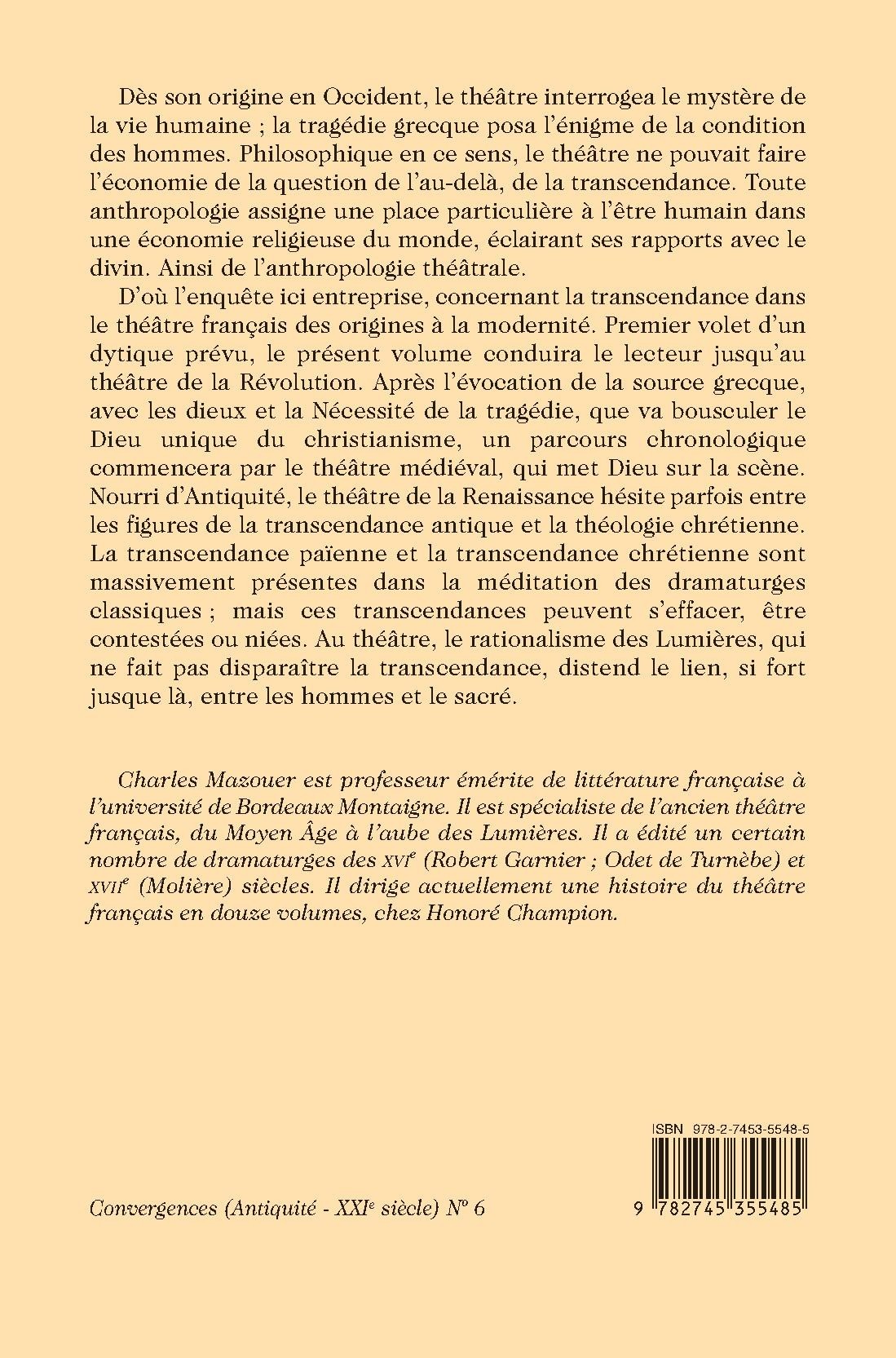 D’où l’enquête ici entreprise, concernant la transcendance dans le théâtre français des origines à la modernité. Premier volet d’un dytique prévu, le présent volume conduira le lecteur jusqu’au théâtre de la Révolution. Après l’évocation de la source grecque, avec les dieux et la Nécessité de la tragédie, que va bousculer le Dieu unique du christianisme, un parcours chronologique commencera par le théâtre médiéval, qui met Dieu sur la scène. Nourri d’Antiquité, le théâtre de la Renaissance hésite parfois entre les figures de la transcendance antique et la théologie chrétienne. La transcendance païenne et la transcendance chrétienne sont massivement présentes dans la méditation des dramaturges classiques ; mais ces transcendances peuvent s’effacer, être contestées ou niées. Au théâtre, le rationalisme des Lumières, qui ne fait pas disparaître la transcendance, distend le lien, si fort jusque là, entre les hommes et le sacré.
