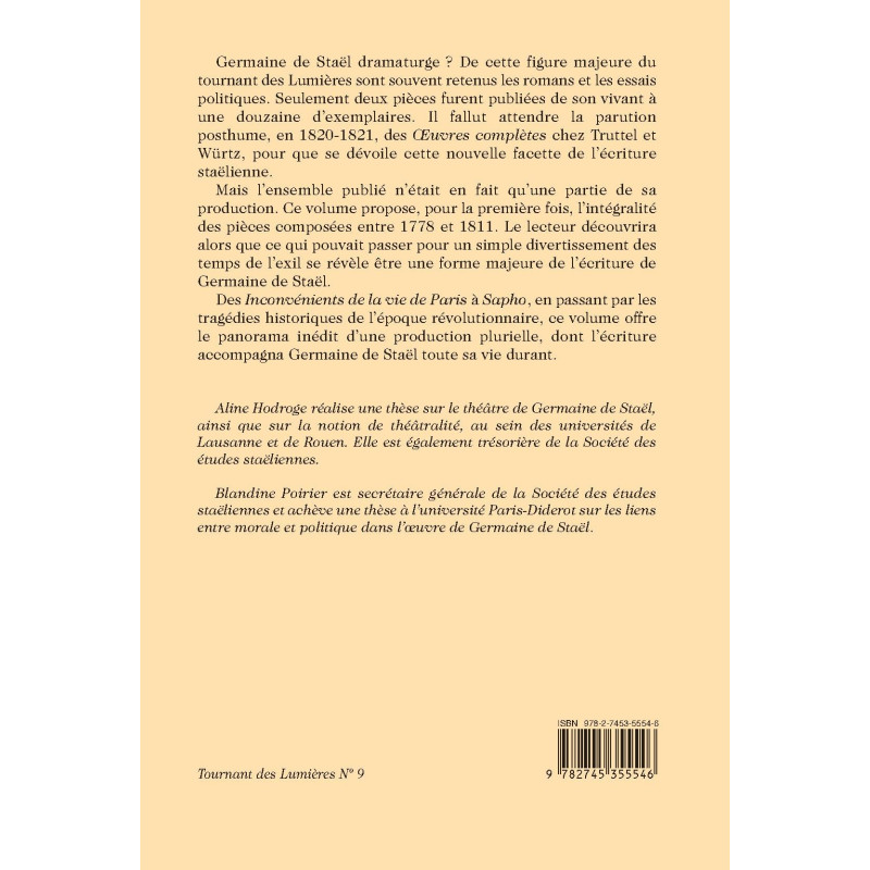 Germaine de Staël dramaturge ? De cette figure majeure du tournant des Lumières sont souvent retenus les romans et les essais politiques. Seulement deux pièces furent publiées de son vivant à une douzaine d’exemplaires. Il fallut attendre la parution posthume, en 1820-1821, des Œuvres complètes chez Truttel et Würtz, pour que se dévoile cette nouvelle facette de l’écriture staëlienne.