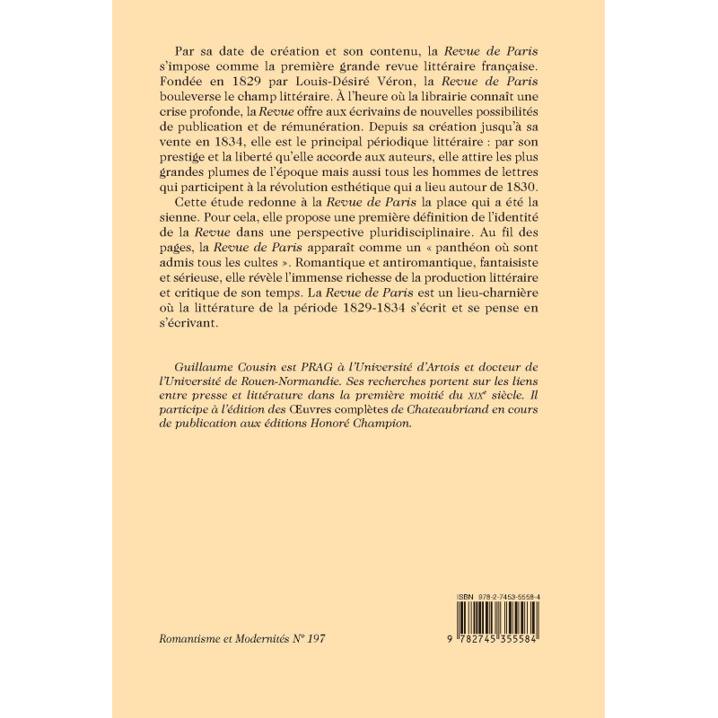 Cette étude redonne à la Revue de Paris la place qui a été la sienne. Pour cela, elle propose une première définition de l’identité de la Revue dans une perspective pluridisciplinaire. Au fil des pages, la Revue de Paris apparaît comme un « panthéon où sont admis tous les cultes ». Romantique et antiromantique, fantaisiste et sérieuse, elle révèle l’immense richesse de la production littéraire et critique de son temps. La Revue de Paris est un lieu-charnière où la littérature de la période 1829-1834 s’écrit et se pense en s’écrivant.